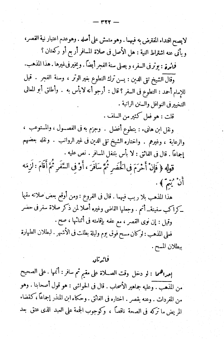 فَائِدَةٌ: يُوتِرُ فِي السَّفَرِ، وَيُصَلِّي سُنَّةَ الْفَجْرِ أَيْضًا، وَيُخَيَّرُ فِي غَيْرِهَا، هَذَا الْمَذْهَبُ، وَقَالَ الشَّيْخُ تَقِيُّ الدِّينِ: يُسَنُّ تَرْكُ التَّطَوُّعِ بِغَيْرِ الْوِتْرِ، وَسُنَّةِ الْفَجْرِ قِيلَ لِلْإِمَامِ أَحْمَدَ: التَّطَوُّعُ فِي السَّفَرِ؟ قَالَ: أَرْجُو أَنَّهُ لَا بَأْسَ بِهِ، وَأَطْلَقَ أَبُو الْمَعَالِي التَّخْيِيرَ فِي النَّوَافِلِ وَالسُّنَنِ الرَّاتِبَةِ. قُلْت: هُوَ فِعْلُ كَثِيرٍ مِنْ السَّلَفِ، وَنَقَلَ ابْنُ هَانِئٍ: يَتَطَوَّعُ أَفْضَلُ وَجَزَمَ بِهِ فِي الْفُصُولِ، وَالْمُسْتَوْعِبِ، وَالرِّعَايَةِ، وَغَيْرِهِمْ وَاخْتَارَهُ الشَّيْخُ تَقِيُّ الدِّينِ فِي غَيْرِ الرَّوَاتِبِ، وَنَقَلَهُ بَعْضُهُمْ إجْمَاعًا قَالَ فِي الْفَائِقِ: لَا بَأْسَ بِتَنَفُّلِ الْمُسَافِرِ. نَصَّ عَلَيْهِ.