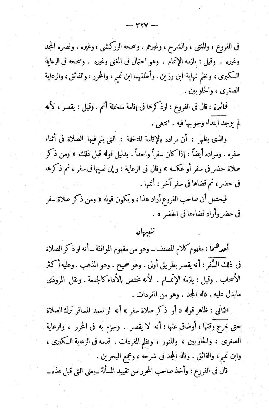 تَنْبِيهَانِ. أَحَدُهُمَا: مَفْهُومُ كَلَامِ الْمُصَنِّفِ وَهُوَ مِنْ مَفْهُومِ الْمُوَافَقَةِ أَنَّهُ لَوْ ذَكَرَ الصَّلَاةَ فِي ذَلِكَ السَّفَرِ: أَنَّهُ يَقْصُرُ بِطَرِيقِ أَوْلَى، وَهُوَ صَحِيحٌ، وَهُوَ الْمَذْهَبُ، وَعَلَيْهِ أَكْثَرُ الْأَصْحَابِ، وَقِيلَ: يَلْزَمُهُ الْإِتْمَامُ؛ لِأَنَّهُ مُخْتَصٌّ بِالْأَدَاءِ كَالْجُمُعَةِ، وَنَقَلَ الْمَرُّوذِيُّ مَا يَدُلُّ عَلَيْهِ، قَالَهُ الْمَجْدُ، وَهُوَ مِنْ الْمُفْرَدَاتِ.