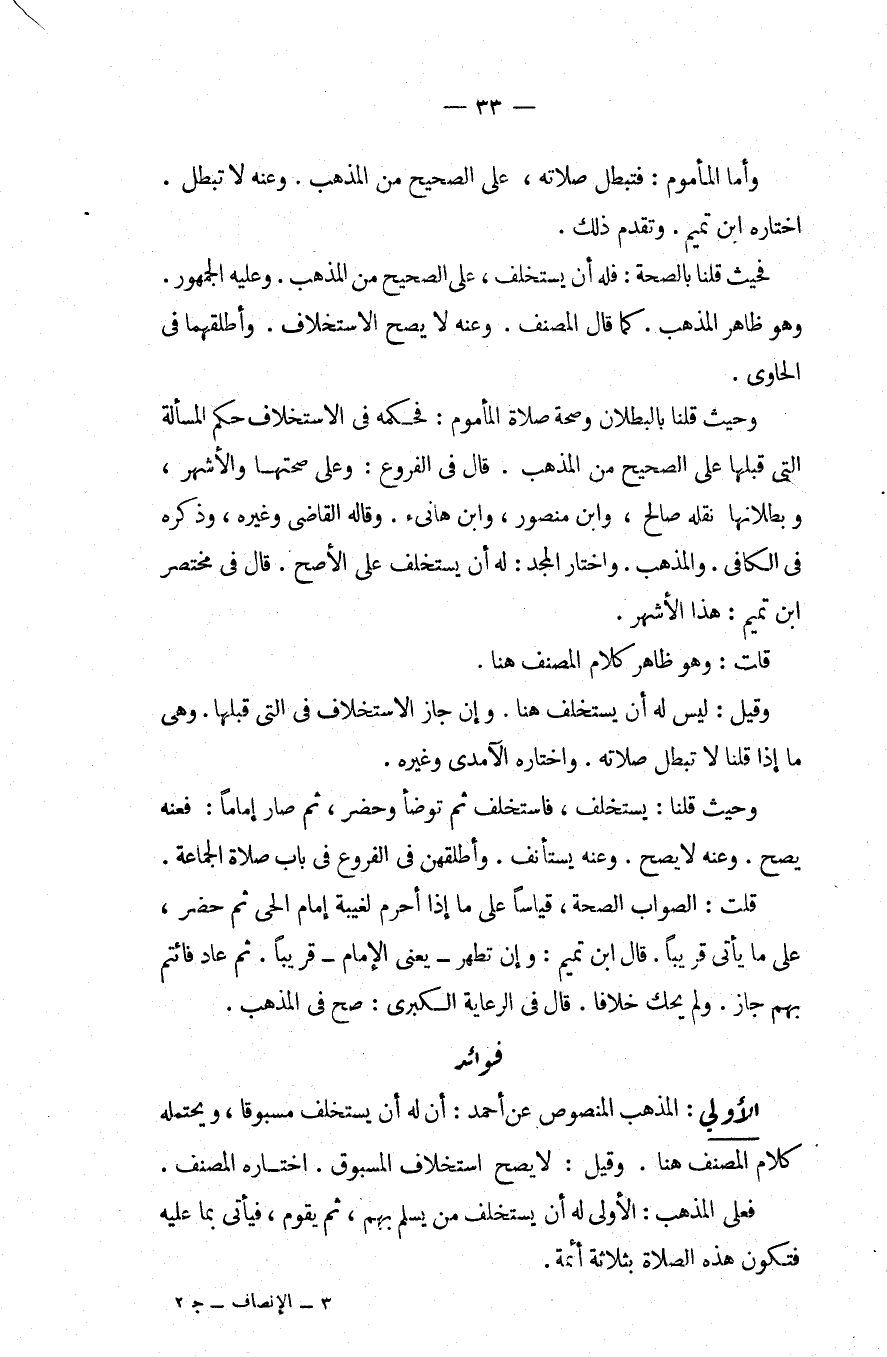 فَوَائِدُ. الْأُولَى: الْمَذْهَبُ الْمَنْصُوصُ عَنْ أَحْمَدَ: أَنَّ لَهُ أَنْ يَسْتَخْلِفَ مَسْبُوقًا، وَيَحْتَمِلُهُ كَلَامُ الْمُصَنِّفِ هُنَا، وَقِيلَ: لَا يَصِحُّ اسْتِخْلَافُ الْمَسْبُوقِ اخْتَارَهُ الْمُصَنِّفُ، فَعَلَى الْمَذْهَبِ: الْأَوْلَى لَهُ أَنْ يَسْتَخْلِفَ مِنْ يُسَلِّمُ بِهِمْ، ثُمَّ يَقُومُ، فَيَأْتِي بِمَا عَلَيْهِ فَتَكُونُ هَذِهِ الصَّلَاةُ بِثَلَاثَةِ أَئِمَّةٍ