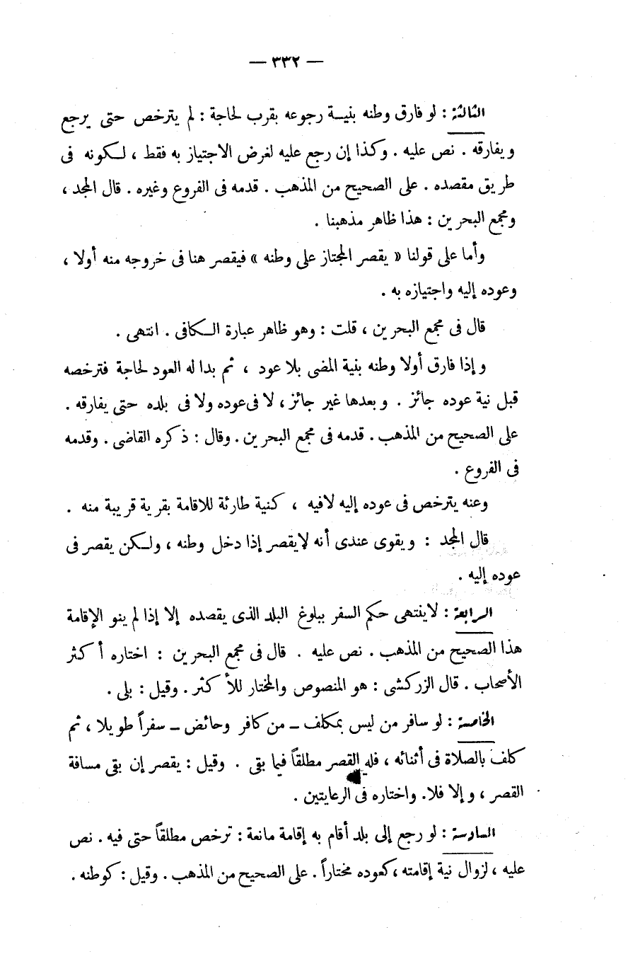 الثَّالِثَةُ: لَوْ فَارَقَ وَطَنَهُ بِنِيَّةِ رُجُوعِهِ بِقُرْبٍ لِحَاجَةٍ: لَمْ يَتَرَخَّصْ حَتَّى يَرْجِعَ وَيُفَارِقَهُ. نَصَّ عَلَيْهِ، وَكَذَا إنْ رَجَعَ عَلَيْهِ لِغَرَضِ الِاجْتِيَازِ بِهِ فَقَطْ، لِكَوْنِهِ فِي طَرِيقِ مَقْصِدِهِ. عَلَى الصَّحِيحِ مِنْ الْمَذْهَبِ، قَدَّمَهُ فِي الْفُرُوعِ وَغَيْرِهِ. قَالَ الْمَجْدُ، وَمَجْمَعُ الْبَحْرَيْنِ: هَذَا ظَاهِرُ مَذْهَبِنَا، وَأَمَّا عَلَى قَوْلِنَا " يَقْصُرُ الْمُجْتَازُ عَلَى وَطَنِهِ " فَيَقْصُرُ هُنَا فِي خُرُوجِهِ مِنْهُ أَوَّلًا، وَعَوْدِهِ إلَيْهِ وَاجْتِيَازِهِ بِهِ. قَالَ فِي مَجْمَعِ الْبَحْرَيْنِ، قُلْت: وَهُوَ ظَاهِرُ عِبَارَةِ الْكَافِي. انْتَهَى. وَإِذَا فَارَقَ أَوَّلًا وَطَنَهُ بِنِيَّةِ الْمُضِيِّ بِلَا عَوْدٍ، ثُمَّ بَدَا لَهُ الْعَوْدُ لِحَاجَةٍ فَتَرَخُّصُهُ قَبْلَ نِيَّةِ عَوْدِهِ جَائِزٌ. وَبَعْدَهَا غَيْرُ جَائِزٍ، لَا فِي عَوْدِهِ وَلَا فِي بَلَدِهِ حَتَّى يُفَارِقَهُ. عَلَى الصَّحِيحِ مِنْ الْمَذْهَبِ، قَدَّمَهُ فِي مَجْمَعِ الْبَحْرَيْنِ. وَقَالَ: ذَكَرَهُ الْقَاضِي. وَقَدَّمَهُ فِي الْفُرُوعِ. وَعَنْهُ يَتَرَخَّصُ فِي عَوْدِهِ إلَيْهِ لَا فِيهِ، كَنِيَّةٍ طَارِئَةٍ لِلْإِقَامَةِ بِقَرْيَةٍ قَرِيبَةٍ مِنْهُ. قَالَ الْمَجْدُ: وَيَقْوَى عِنْدِي أَنَّهُ لَا يَقْصُرُ إذَا دَخَلَ وَطَنَهُ، وَلَكِنْ يَقْصُرُ فِي عَوْدِهِ إلَيْهِ.