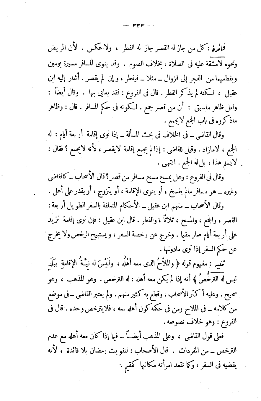 فَائِدَةٌ: كُلُّ مَنْ جَازَ لَهُ الْقَصْرُ جَازَ لَهُ الْفِطْرُ، وَلَا عَكْسَ. لِأَنَّ الْمَرِيضَ وَنَحْوَهُ لَا مَشَقَّةَ عَلَيْهِ فِي الصَّلَاةِ، بِخِلَافِ الصَّوْمِ، وَقَدْ يَنْوِي الْمُسَافِرُ مَسِيرَةَ يَوْمَيْنِ وَيَقْطَعُهُمَا مِنْ الْفَجْرِ إلَى الزَّوَالِ مَثَلًا فَيُفْطِرُ، وَإِنْ لَمْ يَقْصُرْ. أَشَارَ إلَيْهِ ابْنُ عَقِيلٍ، لَكِنَّهُ لَمْ يَذْكُرْ الْفِطْرَ. قَالَ فِي الْفُرُوعِ: فَقَدْ يُعَايَى بِهَا. وَقَالَ أَيْضًا: وَلَعَلَّ ظَاهِرَ مَا سَبَقَ: أَنَّ مَنْ قَصَرَ جَمَعَ. لِكَوْنِهِ فِي حُكْمِ الْمُسَافِرِ. قَالَ: وَظَاهِرُ مَا ذَكَرُوهُ فِي بَابِ الْجَمْعِ لَا يَجْمَعُ. وَقَالَ الْقَاضِي فِي الْخِلَافِ فِي بَحْثِ الْمَسْأَلَةِ إذَا نَوَى إقَامَةَ أَرْبَعَةِ أَيَّامٍ: لَهُ الْجَمْعُ، لَا مَا زَادَ. وَقِيلَ لِلْقَاضِي: إذَا لَمْ يَجْمَعْ إقَامَةً لَا يَقْصُرُ، لِأَنَّهُ لَا يَجْمَعُ؟ فَقَالَ: لَا يُسَلَّمُ هَذَا، بَلْ لَهُ الْجَمْعُ. انْتَهَى. وَقَالَ فِي الْفُرُوعِ: وَهَلْ يَمْسَحُ مَسْحَ مُسَافِرٍ مَنْ قَصَرَ؟ قَالَ الْأَصْحَابُ كَالْقَاضِي وَغَيْرِهِ هُوَ مُسَافِرٌ مَا لَمْ يَفْسَخْ، أَوْ يَنْوِي الْإِقَامَةَ، أَوْ يَتَزَوَّجُ، أَوْ يَقْدِرُ عَلَى أَهْلٍ. وَقَالَ الْأَصْحَابُ مِنْهُمْ ابْنُ عَقِيلٍ الْأَحْكَامُ الْمُتَعَلِّقَةُ بِالسَّفَرِ الطَّوِيلِ أَرْبَعَةٌ: الْقَصْرُ، وَالْجَمْعُ، وَالْمَسْحُ، ثَلَاثًا، وَالْفِطْرُ. قَالَ ابْنُ عَقِيلٍ: فَإِنْ نَوَى إقَامَةً تَزِيدُ عَلَى أَرْبَعَةِ أَيَّامٍ صَارَ مُقِيمًا. وَخَرَجَ عَنْ رُخْصَةِ السَّفَرِ، وَيَسْتَبِيحُ الرُّخْصَ وَلَا يَخْرُجُ عَنْ حُكْمِ السَّفَرِ إذَا نَوَى مَا دُونَهَا.
