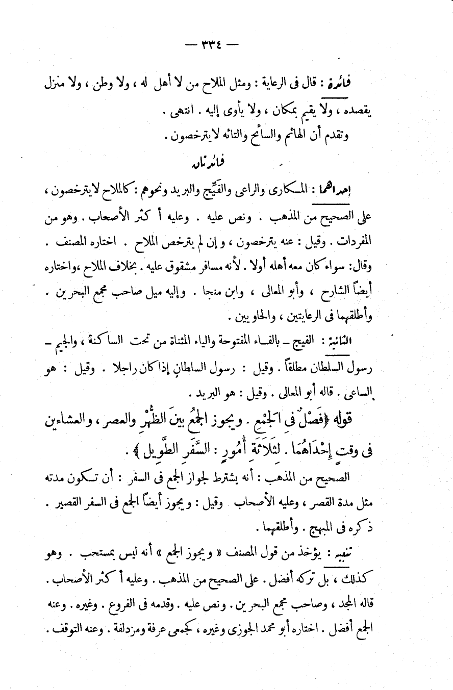 فَائِدَتَانِ. إحْدَاهُمَا: الْمُكَارِي وَالرَّاعِي وَالْفَيْجُ وَالْبَرِيدُ وَنَحْوُهُمْ: كَالْمَلَّاحِ لَا يَتَرَخَّصُونَ، عَلَى الصَّحِيحِ مِنْ الْمَذْهَبِ، وَنَصَّ عَلَيْهِ، وَعَلَيْهِ أَكْثَرُ الْأَصْحَابِ. وَهُوَ مِنْ الْمُفْرَدَاتِ. وَقِيلَ: عَنْهُ يَتَرَخَّصُونَ، وَإِنْ لَمْ يَتَرَخَّصْ الْمَلَّاحُ. اخْتَارَهُ الْمُصَنِّفُ. وَقَالَ: سَوَاءٌ كَانَ مَعَهُ أَهْلُهُ أَوْ لَا. لِأَنَّهُ مُسَافِرٌ مَشْقُوقٌ عَلَيْهِ. بِخِلَافِ الْمَلَّاحِ، وَاخْتَارَهُ أَيْضًا الشَّارِحُ، وَأَبُو الْمَعَالِي، وَابْنُ مُنَجَّا. وَإِلَيْهِ مَيْلُ صَاحِبِ مَجْمَعِ الْبَحْرَيْنِ. وَأَطْلَقَهُمَا فِي الرِّعَايَتَيْنِ، وَالْحَاوِيَيْنِ، الثَّانِيَةُ: الْفَيْجُ بِالْفَاءِ الْمَفْتُوحَةِ وَالْيَاءِ الْمُثَنَّاةِ مِنْ تَحْتٍ السَّاكِنَةِ، وَالْجِيمِ رَسُولُ السُّلْطَانِ مُطْلَقًا. وَقِيلَ: رَسُولُ السُّلْطَانِ إذَا كَانَ رَاجِلًا. وَقِيلَ: هُوَ السَّاعِي.، قَالَهُ أَبُو الْمَعَالِي. وَقِيلَ: هُوَ الْبَرِيدُ.