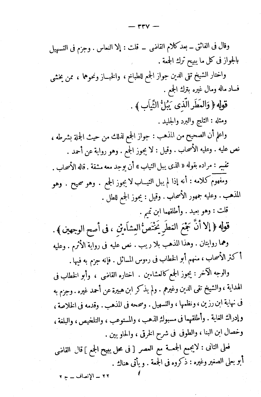 وَمَفْهُومُ كَلَامِهِ: أَنَّهُ إذَا لَمْ يَبُلَّ الثِّيَابَ لَا يَجُوزُ الْجَمْعُ. وَهُوَ صَحِيحٌ، وَهُوَ الْمَذْهَبُ، وَعَلَيْهِ جُمْهُورُ الْأَصْحَابِ. وَقِيلَ: يَجُوزُ الْجَمْعُ لِلطَّلِّ. قُلْت: وَهُوَ بَعِيدٌ. وَأَطْلَقَهُمَا ابْنُ تَمِيمٍ. قَوْلُهُ (إلَّا أَنَّ جَمْعَ الْمَطَرِ يَخْتَصُّ الْعِشَاءَيْنِ، فِي أَصَحِّ الْوَجْهَيْنِ) . وَهُمَا رِوَايَتَانِ، وَهَذَا الْمَذْهَبُ بِلَا رَيْبٍ. نَصَّ عَلَيْهِ فِي رِوَايَةِ الْأَثْرَمِ. وَعَلَيْهِ أَكْثَرُ الْأَصْحَابِ، مِنْهُمْ أَبُو الْخَطَّابِ فِي رُءُوسِ الْمَسَائِلِ. فَإِنَّهُ جَزَمَ بِهِ فِيهَا. وَالْوَجْهُ الْآخَرُ: يَجُوزُ الْجَمْعُ كَالْعِشَاءَيْنِ. اخْتَارَهُ الْقَاضِي، وَأَبُو الْخَطَّابِ فِي الْهِدَايَةِ، وَالشَّيْخُ تَقِيُّ الدِّينُ وَغَيْرُهُمْ. وَلَمْ يَذْكُرْ ابْنُ هُبَيْرَةَ عَنْ أَحْمَدَ غَيْرَهُ. وَجَزَمَ بِهِ فِي نِهَايَةِ ابْنِ رَزِينٍ، وَنَظْمِهَا، وَالتَّسْهِيلِ. وَصَحَّحَهُ فِي الْمُذْهَبِ. وَقَدَّمَهُ فِي الْخُلَاصَةِ، وَإِدْرَاكِ الْغَايَةِ. وَأَطْلَقَهُمَا فِي مَسْبُوكِ الذَّهَبِ، وَالْمُسْتَوْعِبِ، وَالتَّلْخِيصِ، وَالْبُلْغَةِ، وَخِصَالِ ابْنِ الْبَنَّا، وَالطُّوفِيِّ فِي شَرْحِ الْخِرَقِيِّ، وَالْحَاوِيَيْنِ. فَعَلَى الثَّانِي: لَا يَجْمَعُ الْجُمُعَةَ مَعَ الْعَصْرِ [فِي مَحَلٍّ يُبِيحُ الْجَمْعَ] قَالَ الْقَاضِي أَبُو يَعْلَى الصَّغِيرُ وَغَيْرُهُ: ذَكَرُوهُ فِي الْجُمُعَةِ، وَيَأْتِي هُنَاكَ.