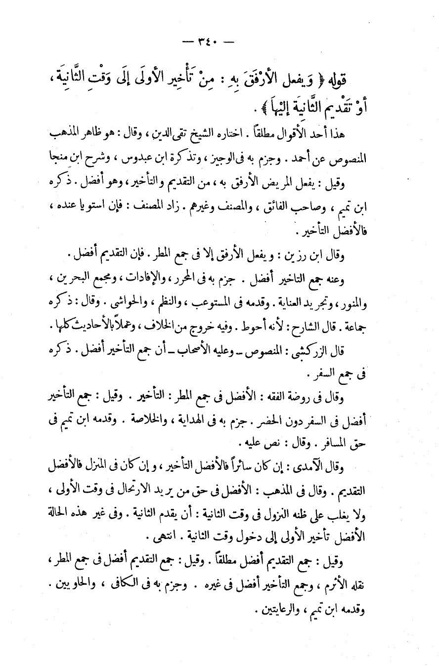 قَوْلُهُ (وَيَفْعَلُ الْأَرْفَقَ بِهِ: مِنْ تَأْخِيرِ الْأُولَى إلَى وَقْتِ الثَّانِيَةِ، أَوْ تَقَدُّمُ الثَّانِيَةِ إلَيْهَا) . هَذَا أَحَدُ الْأَقْوَالِ مُطْلَقًا. اخْتَارَهُ الشَّيْخُ تَقِيُّ الدِّينِ، وَقَالَ: هُوَ ظَاهِرُ الْمَذْهَبِ الْمَنْصُوصِ عَنْ أَحْمَدَ. وَجَزَمَ بِهِ فِي الْوَجِيزِ، وَتَذْكِرَةِ ابْنِ عَبْدُوسٍ، وَشَرْحِ ابْنِ مُنَجَّا وَقِيلَ: يَفْعَلُ الْمَرِيضُ الْأَرْفَقَ بِهِ، مِنْ التَّقْدِيمِ وَالتَّأْخِيرِ، وَهُوَ أَفْضَلُ، ذَكَرَهُ ابْنُ تَمِيمٍ، وَصَاحِبُ الْفَائِقِ، وَالْمُصَنِّفُ وَغَيْرُهُمْ. زَادَ الْمُصَنِّفُ: فَإِنْ اسْتَوَيَا عِنْدَهُ، فَالْأَفْضَلُ التَّأْخِيرُ. وَقَالَ ابْنُ رَزِينٍ: وَيَفْعَلُ الْأَرْفَقَ إلَّا فِي جَمْعِ الْمَطَرِ. فَإِنَّ التَّقْدِيمَ أَفْضَلُ. وَعَنْهُ جَمْعُ التَّأْخِيرِ أَفْضَلُ. جَزَمَ بِهِ فِي الْمُحَرَّرِ، وَالْإِفَادَاتِ، وَمَجْمَعِ الْبَحْرَيْنِ، وَالْمُنَوِّرِ، وَتَجْرِيدِ الْعِنَايَةِ. وَقَدَّمَهُ فِي الْمُسْتَوْعِبِ، وَالنَّظْمِ، وَالْحَوَاشِي. وَقَالَ: ذَكَرَهُ جَمَاعَةٌ. قَالَ الشَّارِحُ: لِأَنَّهُ أَحْوَطُ. وَفِيهِ خُرُوجٌ مِنْ الْخِلَافِ، وَعَمَلًا بِالْأَحَادِيثِ كُلِّهَا. قَالَ الزَّرْكَشِيُّ: الْمَنْصُوصُ وَعَلَيْهِ الْأَصْحَابُ أَنَّ جَمْعَ التَّأْخِيرِ أَفْضَلُ. ذَكَرَهُ فِي جَمْعِ السَّفَرِ. وَقَالَ فِي رَوْضَةِ الْفِقْهِ: الْأَفْضَلُ فِي جَمْعِ الْمَطَرِ: التَّأْخِيرُ. وَقِيلَ: جَمْعُ التَّأْخِيرِ أَفْضَلُ فِي السَّفَرِ دُونَ الْحَضَرِ. جَزَمَ بِهِ فِي الْهِدَايَةِ، وَالْخُلَاصَةِ. وَقَدَّمَهُ ابْنُ تَمِيمٍ فِي حَقِّ الْمُسَافِرِ. وَقَالَ: نَصَّ عَلَيْهِ، وَقَالَ الْآمِدِيُّ: إنْ كَانَ سَائِرًا فَالْأَفْضَلُ التَّأْخِيرُ، وَإِنْ كَانَ فِي الْمَنْزِلِ فَالْأَفْضَلُ التَّقْدِيمُ. وَقَالَ فِي الْمُذْهَبِ: الْأَفْضَلُ فِي حَقِّ مَنْ يُرِيدُ الِارْتِحَالَ فِي وَقْتِ الْأُولَى، وَلَا يَغْلِبُ عَلَى ظَنِّهِ النُّزُولُ فِي وَقْتِ الثَّانِيَةِ: أَنْ يُقَدِّمَ الثَّانِيَةَ. وَفِي غَيْرِ هَذِهِ الْحَالَةِ الْأَفْضَلُ تَأْخِيرُ الْأُولَى إلَى دُخُولِ وَقْتِ الثَّانِيَةِ. انْتَهَى. وَقِيلَ: جَمْعُ التَّقْدِيمِ أَفْضَلُ مُطْلَقًا. وَقِيلَ: جَمْعُ التَّقْدِيمِ أَفْضَلُ فِي جَمْعِ الْمَطَرِ، نَقَلَهُ الْأَثْرَمُ، وَجَمْعُ التَّأْخِيرِ أَفْضَلُ فِي غَيْرِهِ. وَجَزَمَ بِهِ فِي الْكَافِي، وَالْحَاوِيَيْنِ. وَقَدَّمَهُ ابْنُ تَمِيمٍ، وَالرِّعَايَتَيْنِ.