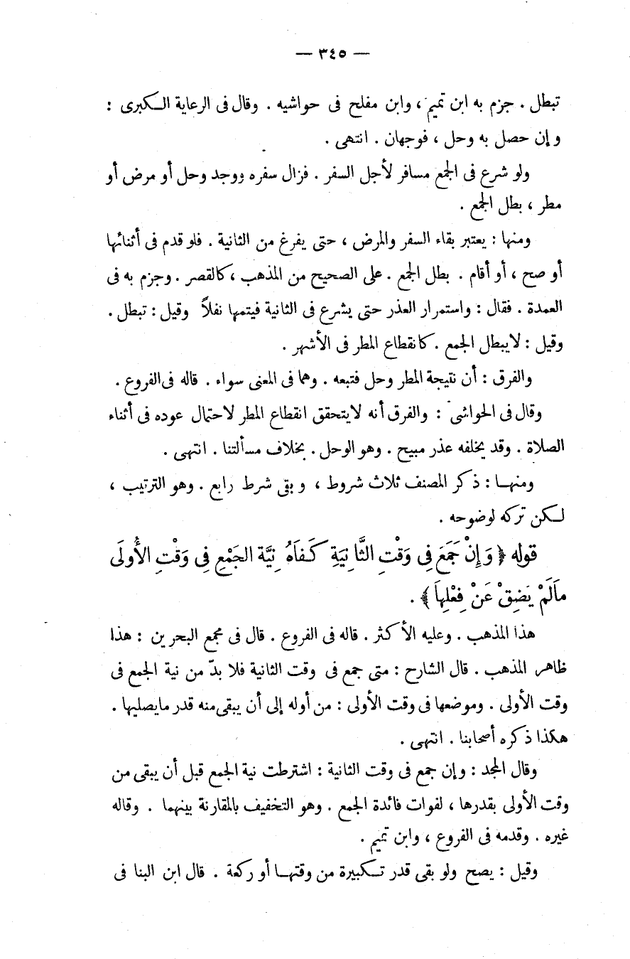 وَمِنْهَا: يُعْتَبَرُ بَقَاءُ السَّفَرِ وَالْمَرَضِ، حَتَّى يَفْرُغُ مِنْ الثَّانِيَةِ. فَلَوْ قَدِمَ فِي أَثْنَائِهَا أَوْ صَحَّ، أَوْ أَقَامَ. بَطَلَ الْجَمْعُ. عَلَى الصَّحِيحِ مِنْ الْمَذْهَبِ. كَالْقَصْرِ. وَجَزَمَ بِهِ فِي الْعُمْدَةِ. فَقَالَ: وَاسْتِمْرَارُ الْعُذْرِ حَتَّى يَشْرَعَ فِي الثَّانِيَةِ فَيُتِمُّهَا نَفْلًا، وَقِيلَ: تَبْطُلُ. وَقِيلَ: لَا يَبْطُلُ الْجَمْعُ. كَانْقِطَاعِ الْمَطَرِ فِي الْأَشْهَرِ. وَالْفَرْقُ: أَنَّ نَتِيجَةَ الْمَطَرِ وَحْلٌ فَتَبِعَهُ. وَهُمَا فِي الْمَعْنَى سَوَاءٌ، قَالَهُ فِي الْفُرُوعِ. وَقَالَ فِي الْحَوَاشِي: وَالْفَرْقُ أَنَّهُ لَا يَتَحَقَّقُ انْقِطَاعُ الْمَطَرِ لِاحْتِمَالِ عَوْدِهِ فِي أَثْنَاءِ الصَّلَاةِ. وَقَدْ يَخْلُفُهُ عُذْرٌ مُبِيحٌ. وَهُوَ الْوَحْلُ. بِخِلَافِ مَسْأَلَتِنَا. انْتَهَى.