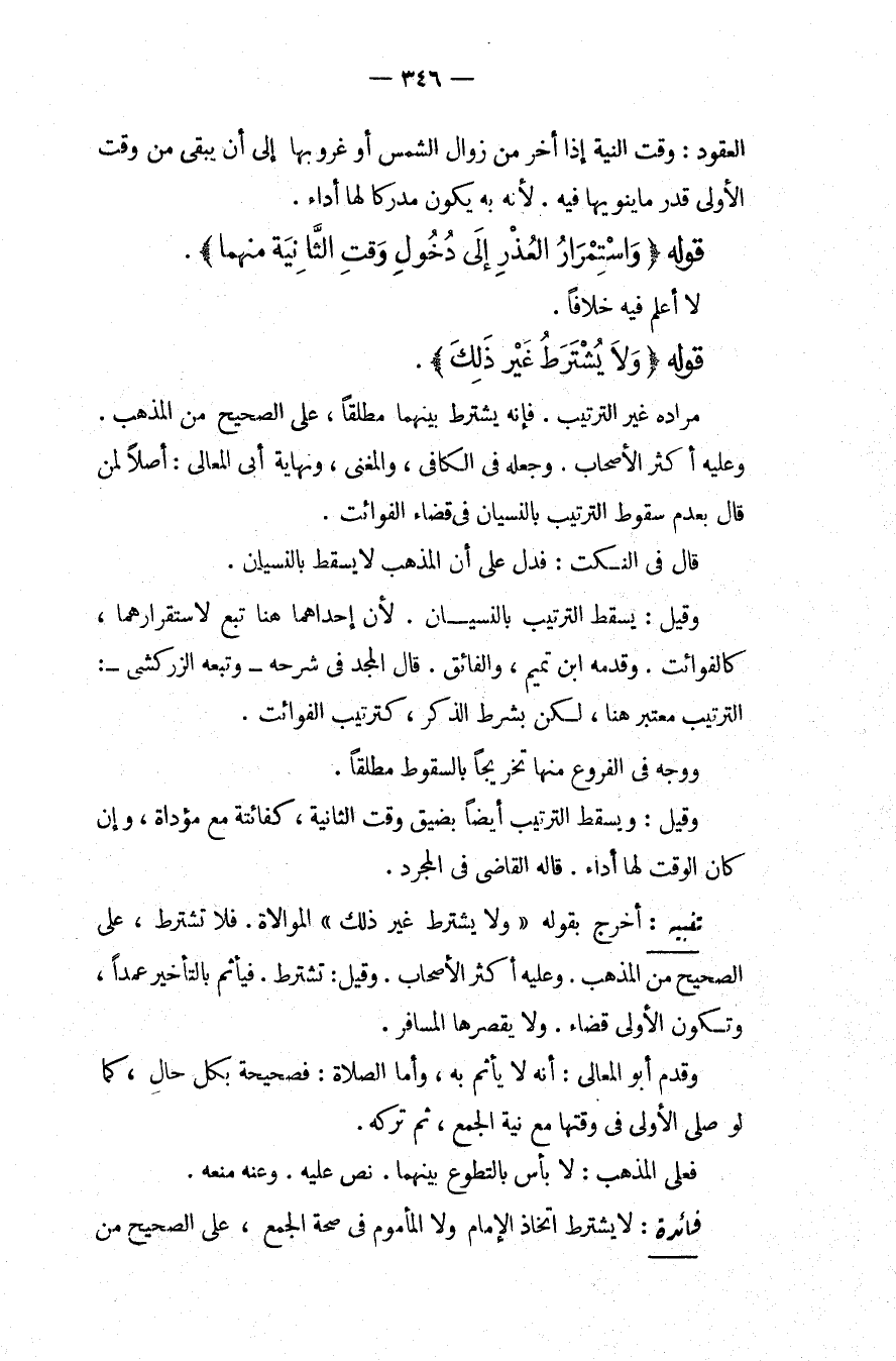 تَنْبِيهٌ: أَخْرَجَ بِقَوْلِهِ (وَلَا يُشْتَرَطُ غَيْرُ ذَلِكَ) الْمُوَالَاةُ. فَلَا تُشْتَرَطُ، عَلَى الصَّحِيحِ مِنْ الْمَذْهَبِ، وَعَلَيْهِ أَكْثَرُ الْأَصْحَابِ. وَقِيلَ: تُشْتَرَطُ. فَيَأْثَمُ بِالتَّأْخِيرِ عَمْدًا، وَتَكُونُ الْأُولَى قَضَاءً. وَلَا يَقْصُرُهَا الْمُسَافِرُ. وَقَدَّمَ أَبُو الْمَعَالِي: أَنَّهُ لَا يَأْثَمُ بِهِ، وَأَمَّا الصَّلَاةُ: فَصَحِيحَةٌ بِكُلِّ حَالٍ. كَمَا لَوْ صَلَّى الْأُولَى فِي وَقْتِهَا مَعَ نِيَّةِ الْجَمْعِ، ثُمَّ تَرَكَهُ. فَعَلَى الْمَذْهَبِ: لَا بَأْسَ بِالتَّطَوُّعِ بَيْنَهُمَا. نَصَّ عَلَيْهِ، وَعَنْهُ مَنْعُهُ.