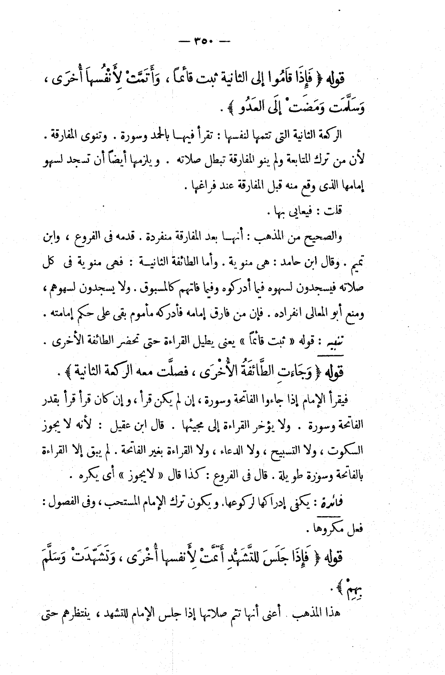 قَوْلُهُ (فَإِذَا قَامُوا إلَى الثَّانِيَةِ ثَبَتَ قَائِمًا، وَأَتَمَّتْ لِأَنْفُسِهَا أُخْرَى، وَسَلَّمَتْ وَمَضَتْ إلَى الْعَدُوِّ) . الرَّكْعَةُ الثَّانِيَةُ الَّتِي تُتِمُّهَا لِنَفْسِهَا: تَقْرَأُ فِيهَا بِالْحَمْدِ وَسُورَةٍ. وَتَنْوِي الْمُفَارَقَةَ؛ لِأَنَّ مَنْ تَرَكَ الْمُتَابَعَةَ وَلَمْ يَنْوِ الْمُفَارَقَةَ تَبْطُلُ صَلَاتُهُ. وَيَلْزَمُهَا أَيْضًا أَنْ تَسْجُدَ لِسَهْوِ إمَامِهَا الَّذِي وَقَعَ مِنْهُ قَبْلَ الْمُفَارَقَةِ عِنْدَ فَرَاغِهَا. قُلْت: فَيُعَايَى بِهَا. وَالصَّحِيحُ مِنْ الْمَذْهَبِ: أَنَّهَا بَعْدَ الْمُفَارَقَةِ مُنْفَرِدَةٌ. قَدَّمَهُ فِي الْفُرُوعِ، وَابْنُ تَمِيمٍ. وَقِيلَ ابْنُ حَامِدٍ: هِيَ مَنْوِيَّةٌ. وَأَمَّا الطَّائِفَةُ الثَّانِيَةُ: فَهِيَ مَنْوِيَّةٌ فِي كُلِّ صَلَاتِهِ فَيَسْجُدُونَ لِسَهْوِهِ فِيمَا أَدْرَكُوهُ وَفِيمَا فَاتَهُمْ كَالْمَسْبُوقِ. وَلَا يَسْجُدُونَ لِسَهْوِهِمْ، وَمَنَعَ أَبُو الْمَعَالِي انْفِرَادَهُ. فَإِنَّ مَنْ فَارَقَ إمَامَهُ فَأَدْرَكَهُ مَأْمُومٌ بَقِيَ عَلَى حُكْمِ إمَامَتِهِ.