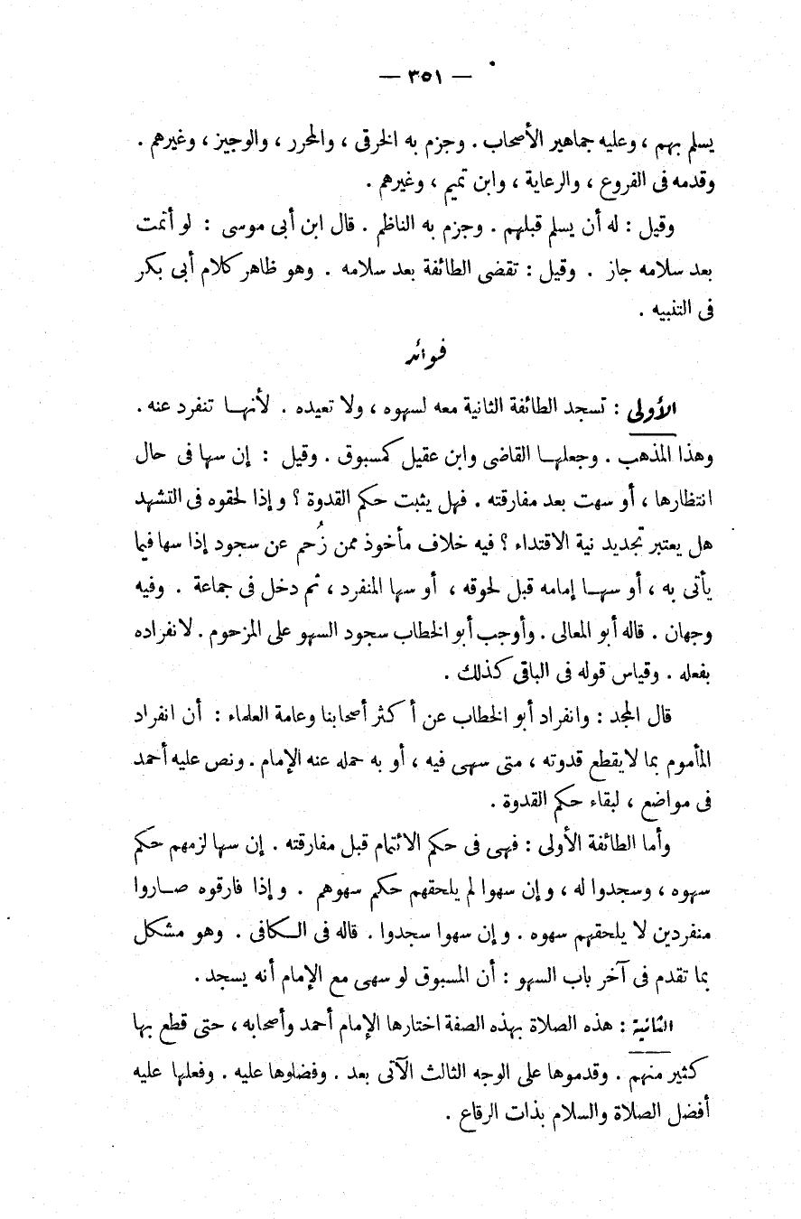 فَوَائِدُ. الْأُولَى: تَسْجُدُ الطَّائِفَةُ الثَّانِيَةُ مَعَهُ لِسَهْوِهِ، وَلَا تُعِيدُهُ؛ لِأَنَّهَا تَنْفَرِدُ عَنْهُ، وَهَذَا الْمَذْهَبُ، وَجَعَلَهَا الْقَاضِي وَابْنُ عَقِيلٍ كَمَسْبُوقٍ. وَقِيلَ: إنْ سَهَا فِي حَالِ انْتِظَارِهَا، أَوْ سَهَتْ بَعْدَ مُفَارَقَتِهِ. فَهَلْ يَثْبُتُ حُكْمُ الْقُدْوَةِ؟ وَإِذَا لَحِقُوهُ فِي التَّشَهُّدِ هَلْ يُعْتَبَرُ تَجْدِيدُ نِيَّةِ الِاقْتِدَاءِ؟ فِيهِ خِلَافٌ مَأْخُوذٌ مِمَّنْ زُحِمَ عَنْ سُجُودٍ إذَا سَهَا فِيمَا يَأْتِي بِهِ، أَوْ سَهَا إمَامُهُ قَبْلَ لُحُوقِهِ، أَوْ سَهَا الْمُنْفَرِدُ، ثُمَّ دَخَلَ فِي جَمَاعَةٍ. وَفِيهِ وَجْهَانِ، قَالَهُ أَبُو الْمَعَالِي. وَأَوْجَبَ أَبُو الْخَطَّابِ سُجُودَ السَّهْوِ عَلَى الْمَزْحُومِ؛ لِانْفِرَادِهِ بِفِعْلِهِ وَقِيَاسُ قَوْلِهِ فِي الْبَاقِي كَذَلِكَ.