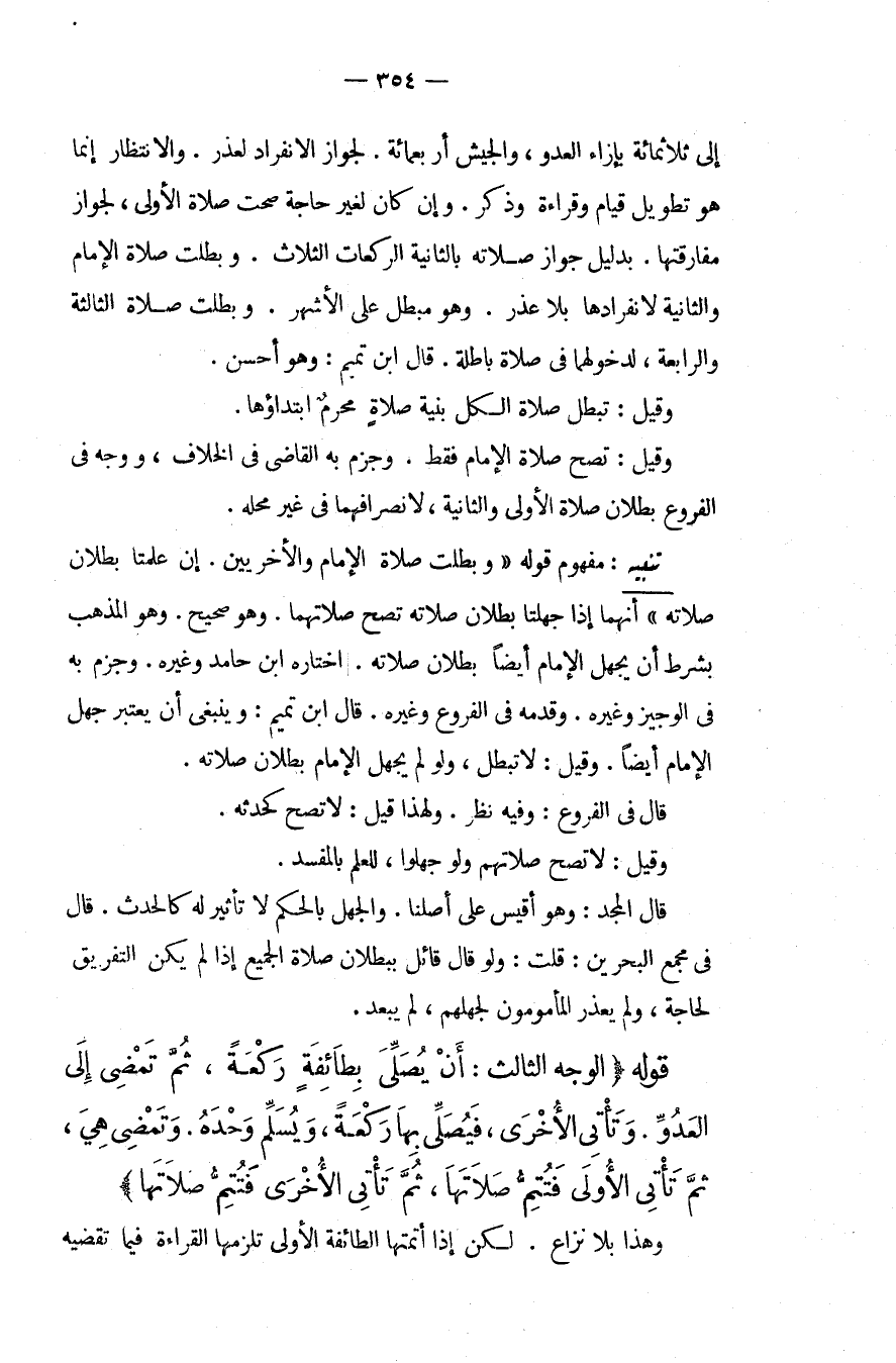 إلَى ثَلَاثِمِائَةٍ بِإِزَاءِ الْعَدُوِّ، وَالْجَيْشُ أَرْبَعُمِائَةٍ. لِجَوَازِ الِانْفِرَادِ لِعُذْرٍ. وَالِانْتِظَارُ إنَّمَا هُوَ تَطْوِيلُ قِيَامٍ وَقِرَاءَةٍ وَذِكْرٍ. وَإِنْ كَانَ لِغَيْرِ حَاجَةٍ صَحَّتْ صَلَاةُ الْأُولَى، لِجَوَازِ مُفَارَقَتِهَا. بِدَلِيلِ جَوَازِ صَلَاتِهِ بِالثَّانِيَةِ الرَّكَعَاتِ الثَّلَاثَ. وَبَطَلَتْ صَلَاةُ الْإِمَامِ وَالثَّانِيَةُ لِانْفِرَادِهَا بِلَا عُذْرٍ. وَهُوَ مُبْطِلٌ عَلَى الْأَشْهَرِ، وَبَطَلَتْ صَلَاةُ الثَّالِثَةِ وَالرَّابِعَةِ، لِدُخُولِهِمَا فِي صَلَاةٍ بَاطِلَةٍ. قَالَ ابْنُ تَمِيمٍ: وَهُوَ أَحْسَنُ، وَقِيلَ: تَبْطُلُ صَلَاةُ الْكُلِّ بِنِيَّةِ صَلَاةٍ مُحَرَّمٍ ابْتِدَاؤُهَا. وَقِيلَ: تَصِحُّ صَلَاةُ الْإِمَامِ فَقَطْ. وَجَزَمَ بِهِ الْقَاضِي فِي الْخِلَافِ، وَوَجَّهَ فِي الْفُرُوعِ بُطْلَانَ صَلَاةِ الْأُولَى وَالثَّانِيَةِ، لِانْصِرَافِهِمَا فِي غَيْرِ مَحَلِّهِ.