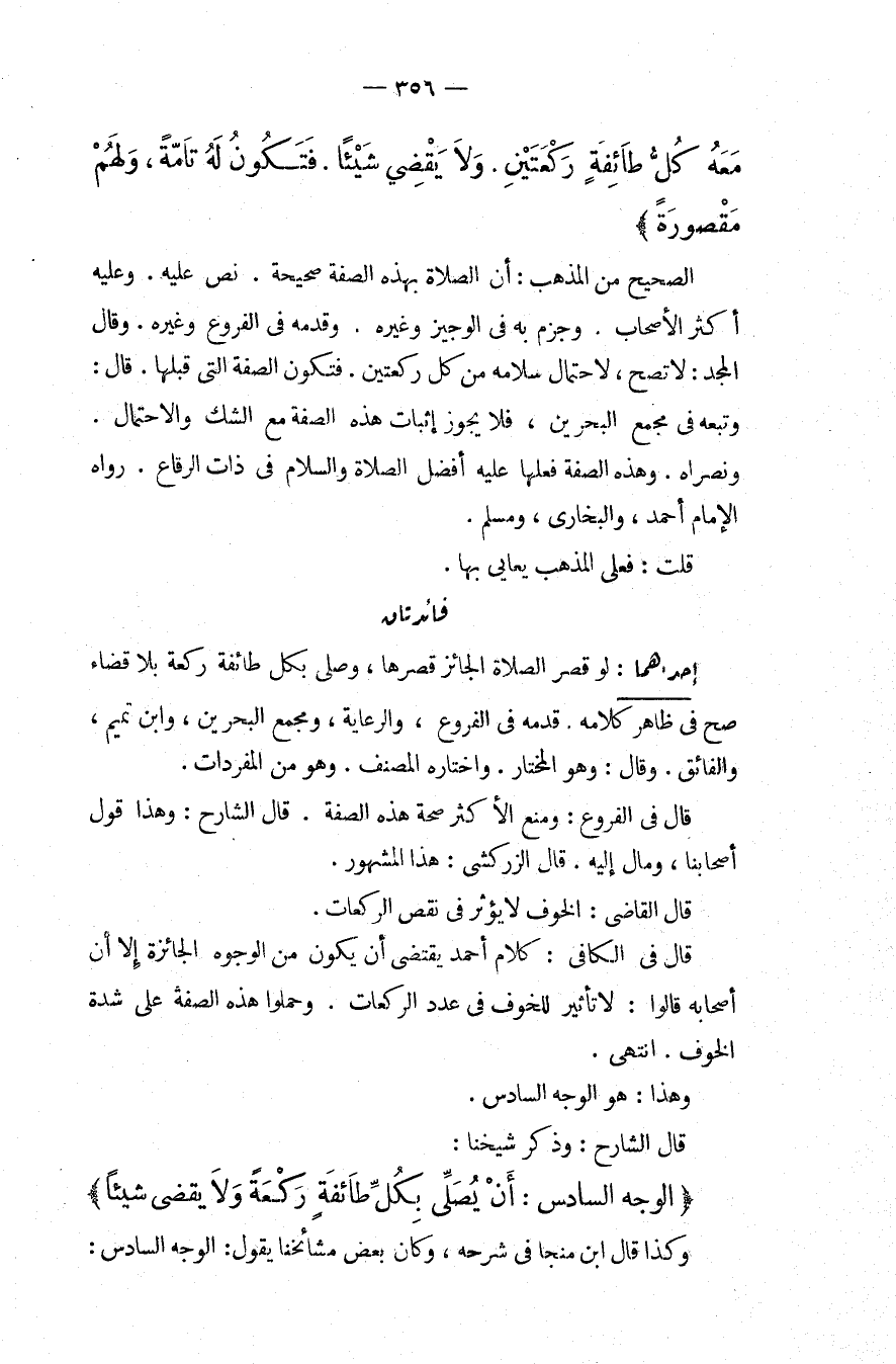 مَعَهُ كُلُّ طَائِفَةٍ رَكْعَتَيْنِ. وَلَا يَقْضِيَ شَيْئًا. فَتَكُونُ لَهُ تَامَّةً، وَلَهُمْ مَقْصُورَةً) الصَّحِيحُ مِنْ الْمَذْهَبِ: أَنَّ الصَّلَاةَ بِهَذِهِ الصِّفَةِ صَحِيحَةٌ. نَصَّ عَلَيْهِ، وَعَلَيْهِ أَكْثَرُ الْأَصْحَابِ. وَجَزَمَ بِهِ فِي الْوَجِيزِ وَغَيْرِهِ. وَقَدَّمَهُ فِي الْفُرُوعِ وَغَيْرِهِ. وَقَالَ الْمَجْدُ: لَا تَصِحُّ، لِاحْتِمَالِ سَلَامِهِ مِنْ كُلِّ رَكْعَتَيْنِ. فَتَكُونُ الصِّفَةُ الَّتِي قَبْلَهَا. قَالَ: وَتَبِعَهُ فِي مَجْمَعِ الْبَحْرَيْنِ، فَلَا يَجُوزُ إثْبَاتُ هَذِهِ الصِّفَةِ مَعَ الشَّكِّ وَالِاحْتِمَالِ. وَنَصَرَاهُ. وَهَذِهِ الصِّفَةُ فَعَلَهَا عَلَيْهِ أَفْضَلُ الصَّلَاةِ وَالسَّلَامِ فِي ذَاتِ الرِّقَاعِ. رَوَاهُ الْإِمَامُ أَحْمَدُ، وَالْبُخَارِيُّ، وَمُسْلِمٌ. قُلْت: فَعَلَى الْمَذْهَبِ يُعَايَى بِهَا.