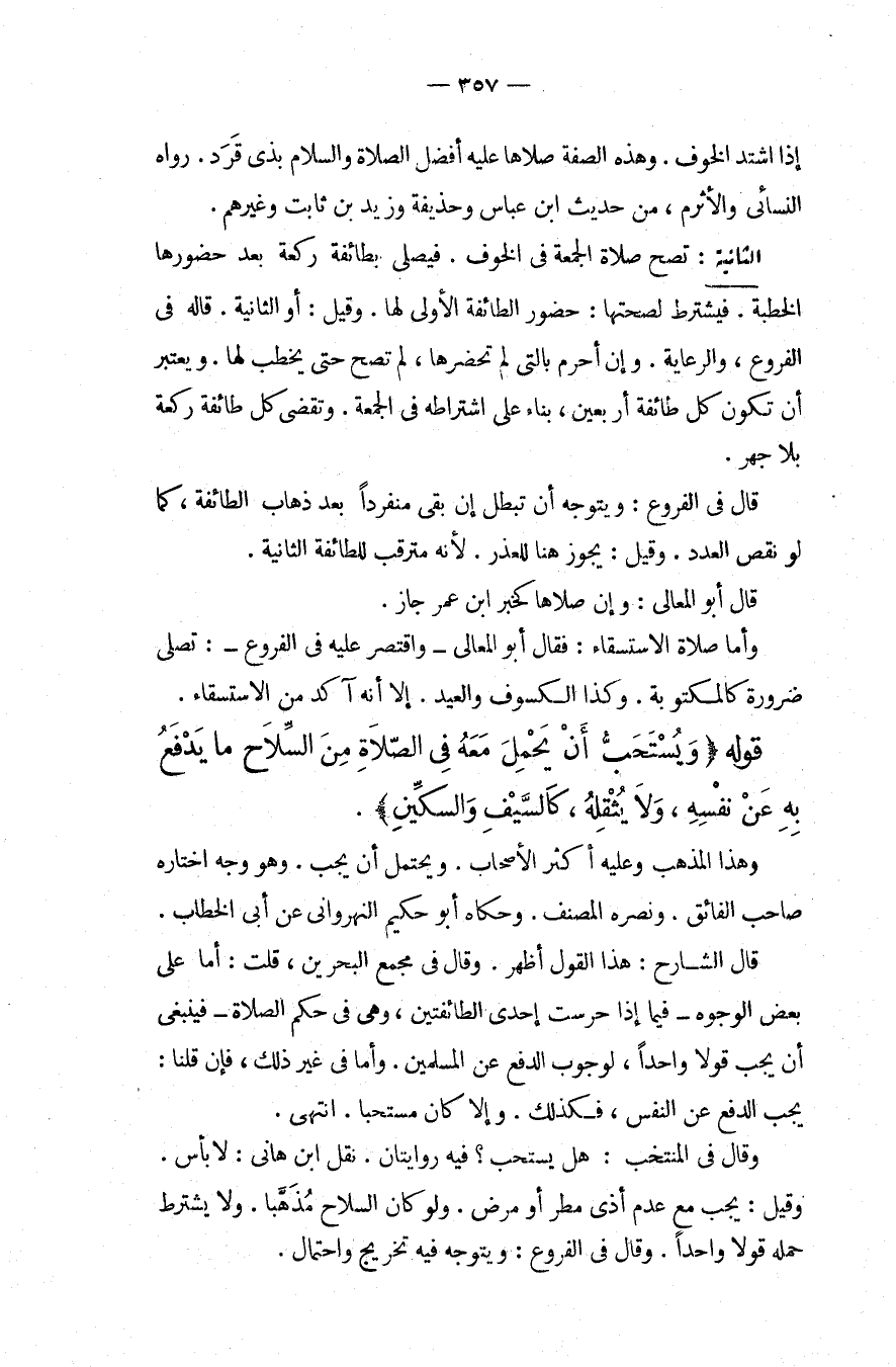 قَوْلُهُ (وَيُسْتَحَبُّ أَنْ يَحْمِلَ مَعَهُ فِي الصَّلَاةِ مِنْ السِّلَاحِ مَا يَدْفَعُ بِهِ عَنْ نَفْسِهِ، وَلَا يُثْقِلُهُ، كَالسَّيْفِ وَالسِّكِّينِ) . وَهَذَا الْمَذْهَبُ وَعَلَيْهِ أَكْثَرُ الْأَصْحَابِ. وَيُحْتَمَلُ أَنْ يَجِبَ. وَهُوَ وَجْهٌ اخْتَارَهُ صَاحِبُ الْفَائِقِ. وَنَصَرَهُ الْمُصَنِّفُ. وَحَكَاهُ أَبُو حَكِيمٍ النَّهْرَوَانِيُّ عَنْ أَبِي الْخَطَّابِ. قَالَ الشَّارِحُ: هَذَا الْقَوْلُ أَظْهَرُ. وَقَالَ فِي مَجْمَعِ الْبَحْرَيْنِ، قُلْت: أَمَّا عَلَى بَعْضِ الْوُجُوهِ فِيمَا إذَا حَرَسَتْ إحْدَى الطَّائِفَتَيْنِ، وَهِيَ فِي حُكْمِ الصَّلَاةِ فَيَنْبَغِي أَنْ يَجِبَ قَوْلًا وَاحِدًا؛ لِوُجُوبِ الدَّفْعِ عَنْ الْمُسْلِمِينَ. وَأَمَّا فِي غَيْرِ ذَلِكَ، فَإِنْ قُلْنَا: يَجِبُ الدَّفْعُ عَنْ النَّفْسِ، فَكَذَلِكَ. وَإِلَّا كَانَ مُسْتَحَبًّا. انْتَهَى. وَقَالَ فِي الْمُنْتَخَبِ: هَلْ يُسْتَحَبُّ؟ فِيهِ رِوَايَتَانِ، نَقَلَ ابْنُ هَانِئٍ: لَا بَأْسَ. وَقِيلَ: يَجِبُ مَعَ عَدَمِ أَذَى مَطَرٍ أَوْ مَرَضٍ. وَلَوْ كَانَ السِّلَاحُ مُذَهَّبًا. وَلَا يُشْتَرَطُ حَمْلُهُ قَوْلًا وَاحِدًا. وَقَالَ فِي الْفُرُوعِ: وَيُتَوَجَّهُ فِيهِ تَخْرِيجٌ وَاحْتِمَالٌ.