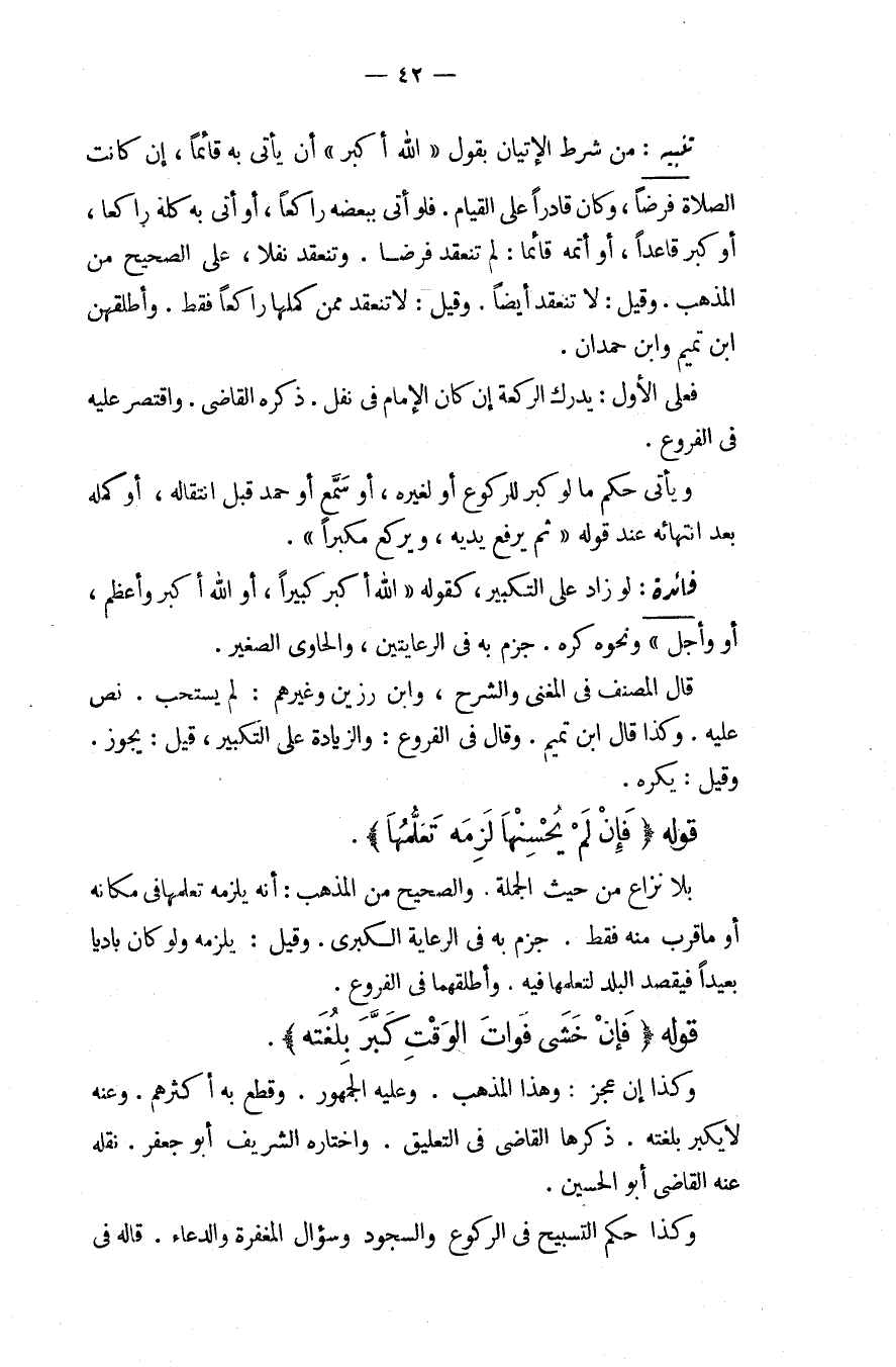 قَالَ الْمُصَنِّفُ فِي الْمُغْنِي وَالشَّرْحِ، وَابْنُ رَزِينٍ وَغَيْرُهُمْ: لَمْ يُسْتَحَبَّ نَصَّ عَلَيْهِ، وَكَذَا قَالَ ابْنُ تَمِيمٍ، وَقَالَ فِي الْفُرُوعِ: وَالزِّيَادَةُ عَلَى التَّكْبِيرِ، قِيلَ: يَجُوزُ. وَقِيلَ: يُكْرَهُ قَوْلُهُ (فَإِنْ لَمْ يُحْسِنْهَا لَزِمَهُ تَعَلُّمُهَا) بِلَا نِزَاعٍ مِنْ حَيْثُ الْجُمْلَةُ وَالصَّحِيحُ مِنْ الْمَذْهَبِ: أَنَّهُ يَلْزَمُهُ تَعَلُّمُهَا فِي مَكَانِهِ أَوْ مَا قَرُبَ مِنْهُ فَقَطْ جَزَمَ بِهِ فِي الرِّعَايَةِ الْكُبْرَى، وَقِيلَ: يَلْزَمُهُ وَلَوْ كَانَ بَادِيًا بَعِيدًا فَيَقْصِدُ الْبَلَدَ لِتَعَلُّمِهَا فِيهِ، وَأَطْلَقَهُمَا فِي الْفُرُوعِ. قَوْلُهُ (فَإِنْ خَشِيَ فَوَاتَ الْوَقْتِ كَبَّرَ بِلُغَتِهِ) ، وَكَذَا إنْ عَجَزَ: وَهَذَا الْمَذْهَبُ، وَعَلَيْهِ الْجُمْهُورُ وَقَطَعَ بِهِ أَكْثَرُهُمْ، وَعَنْهُ لَا يُكَبِّرُ بِلُغَتِهِ. ذَكَرَهَا الْقَاضِي فِي التَّعْلِيقِ وَاخْتَارَهُ الشَّرِيفُ أَبُو جَعْفَرٍ، نَقَلَهُ عَنْهُ الْقَاضِي أَبُو الْحُسَيْنِ.