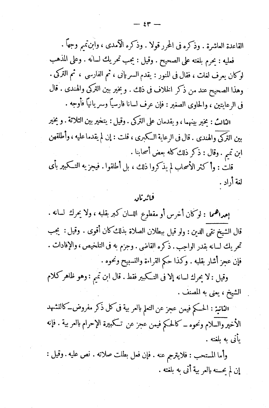 الْقَاعِدَةَ الْعَاشِرَةَ، وَذَكَرَهُ فِي الْمُحَرَّرِ قَوْلًا، وَذَكَرَهُ الْآمِدِيُّ، وَابْنُ تَمِيمٍ وَجْهًا فَعَلَيْهِ: يَحْرُمُ بِلُغَتِهِ عَلَى الصَّحِيحِ، وَقِيلَ: يَجِبُ تَحْرِيكُ لِسَانِهِ، وَعَلَى الْمَذْهَبِ لَوْ كَانَ يَعْرِفُ لُغَاتٍ، فَقَالَ فِي الْمُنَوِّرِ: يُقَدَّمُ السُّرْيَانِيُّ، ثُمَّ الْفَارِسِيُّ، ثُمَّ التُّرْكِيُّ، وَهَذَا الصَّحِيحُ عِنْدَ مَنْ ذَكَرَ الْخِلَافَ فِي ذَلِكَ، وَيُخَيَّرُ بَيْنَ التُّرْكِيِّ وَالْهِنْدِيِّ قَالَ فِي الرِّعَايَتَيْنِ، وَالْحَاوِي الصَّغِيرِ: فَإِنْ عَرَفَ لِسَانًا فَارِسِيًّا وَسُرْيَانِيًّا فَأَوْجَهُ. الثَّالِثُ: يُخَيَّرُ بَيْنَهُمَا، وَيُقَدَّمَانِ عَلَى التُّرْكِيِّ وَقِيلَ: يَتَخَيَّرُ بَيْنَ الثَّلَاثَةِ، وَيُخَيَّرُ بَيْنَ التُّرْكِيِّ وَالْهِنْدِيِّ قَالَ فِي الرِّعَايَةِ الْكُبْرَى، قُلْت: إنْ لَمْ يُقَدَّمَا عَلَيْهِ، وَأَطْلَقَهُنَّ ابْنُ تَمِيمٍ، وَقَالَ: ذَكَرَ ذَلِكَ كُلَّهُ بَعْضُ أَصْحَابِنَا. قُلْت: وَأَكْثَرُ الْأَصْحَابِ لَمْ يَذْكُرُوا ذَلِكَ، بَلْ أَطْلَقُوا فَيُجْزِيهِ التَّكْبِيرُ بِأَيِّ لُغَةٍ أَرَادَ.
