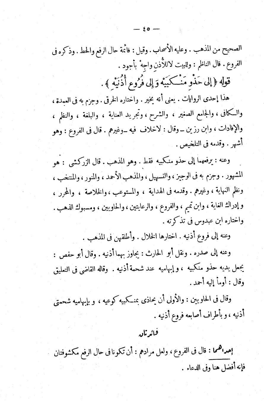 قَوْلُهُ (إلَى حَذْوِ مَنْكِبَيْهِ وَإِلَى فُرُوعِ أُذُنَيْهِ) هَذَا إحْدَى الرِّوَايَاتِ، يَعْنِي أَنَّهُ يُخَيَّرُ. وَاخْتَارَهُ الْخِرَقِيُّ وَجَزَمَ بِهِ فِي الْعُمْدَةِ، وَالْكَافِي، وَالْجَامِعِ الصَّغِيرِ، وَالشَّرْحِ، وَتَجْرِيدِ الْعِنَايَةِ، وَالْبُلْغَةِ، وَالنَّظْمِ، وَالْإِفَادَاتِ، وَابْنُ رَزِينٍ وَقَالَ: لَا خِلَافَ فِيهِ وَغَيْرُهُمْ قَالَ فِي الْفُرُوعِ: وَهُوَ أَشْهَرُ وَقَدَّمَهُ فِي التَّلْخِيصِ، وَعَنْهُ: يَرْفَعُهُمَا إلَى حَذْوِ مَنْكِبَيْهِ فَقَطْ، وَهُوَ الْمَذْهَبُ قَالَ الزَّرْكَشِيُّ: هُوَ الْمَشْهُورُ وَجَزَمَ بِهِ فِي الْوَجِيزِ، وَالتَّسْهِيلِ، وَالْمَذْهَبِ الْأَحْمَدِ، وَالْمُنَوِّرِ، وَالْمُنْتَخَبِ، وَنَظْمِ النِّهَايَةِ، وَغَيْرِهِمْ وَقَدَّمَهُ فِي الْهِدَايَةِ، وَالْمُسْتَوْعِبِ، وَالْخُلَاصَةِ، وَالْمُحَرَّرِ، وَإِدْرَاكِ الْغَايَةِ، وَابْنُ تَمِيمٍ، وَالْفُرُوعِ، وَالرِّعَايَتَيْنِ، وَالْحَاوِيَيْنِ، وَمَسْبُوكِ الذَّهَبِ، وَاخْتَارَهُ ابْنُ عَبْدُوسٍ فِي تَذْكِرَتِهِ، وَعَنْهُ إلَى فُرُوعِ أُذُنَيْهِ، اخْتَارَهَا الْخَلَّالُ، وَأَطْلَقَهُنَّ فِي الْمُذْهَبِ، وَعَنْهُ إلَى صَدْرِهِ، وَنَقَلَ أَبُو الْحَارِثِ: يُجَاوِزُ بِهِمَا أُذُنَيْهِ، وَقَالَ أَبُو حَفْصٍ: يَجْعَلُ يَدَيْهِ حَذْوَ مَنْكِبَيْهِ، وَإِبْهَامَيْهِ عِنْدَ شَحْمَةِ أُذُنَيْهِ، وَقَالَهُ الْقَاضِي فِي التَّعْلِيقِ وَقَالَ: أَوْمَأَ إلَيْهِ أَحْمَدُ، وَقَالَ فِي الْحَاوِيَيْنِ: وَالْأَوْلَى أَنْ يُحَاذِيَ بِمَنْكِبَيْهِ كُوعَيْهِ، وَبِإِبْهَامَيْهِ شَحْمَتَيْ أُذُنَيْهِ، وَبِأَطْرَافِ أَصَابِعِهِ فُرُوعَ أُذُنَيْهِ. فَائِدَتَانِ إحْدَاهُمَا: قَالَ فِي الْفُرُوعِ، وَلَعَلَّ مُرَادَهُمْ: أَنْ تَكُونَا فِي حَالِ الرَّفْعِ مَكْشُوفَتَانِ فَإِنَّهُ أَفْضَلُ هُنَا وَفِي الدُّعَاءِ.