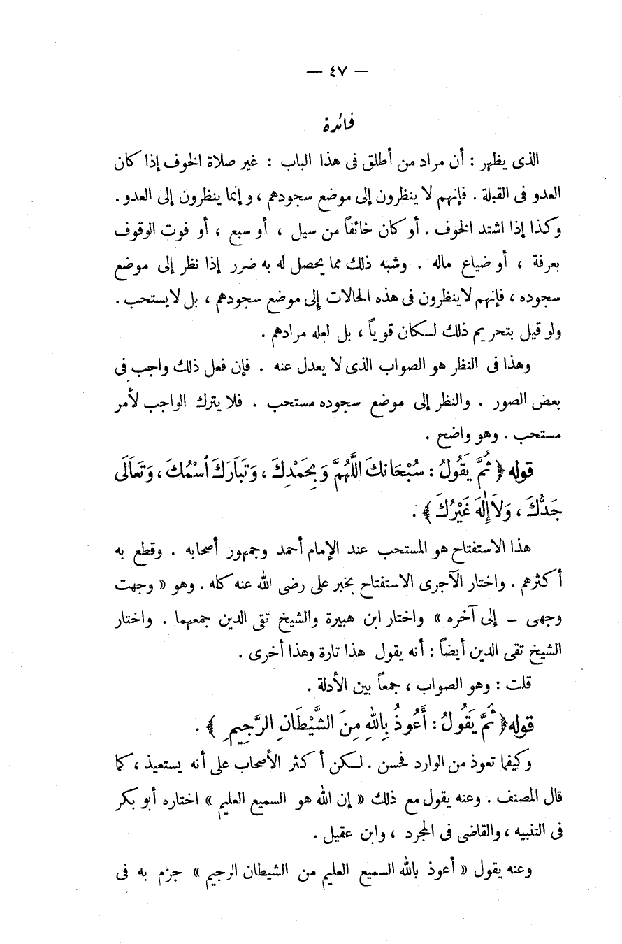 فَائِدَةٌ: الَّذِي يَظْهَرُ: أَنَّ مُرَادَ مَنْ أَطْلَقَ فِي هَذَا الْبَابِ: غَيْرُ صَلَاةِ الْخَوْفِ إذَا كَانَ الْعَدُوُّ فِي الْقِبْلَةِ فَإِنَّهُمْ لَا يَنْظُرُونَ إلَى مَوْضِعِ سُجُودِهِمْ، وَإِنَّمَا يَنْظُرُونَ إلَى الْعَدُوِّ، وَكَذَا إذَا اشْتَدَّ الْخَوْفُ، أَوْ كَانَ خَائِفًا مِنْ سَيْلٍ، أَوْ سَبُعٍ، أَوْ فَوْتِ الْوُقُوفِ بِعَرَفَةَ، أَوْ ضَيَاعِ مَالِهِ، وَشِبْهِ ذَلِكَ مِمَّا يَحْصُلُ لَهُ بِهِ ضَرَرٌ إذَا نَظَرَ إلَى مَوْضِعِ سُجُودِهِ، فَإِنَّهُمْ لَا يَنْظُرُونَ فِي هَذِهِ الْحَالَاتِ إلَى مَوْضِعِ سُجُودِهِ، بَلْ لَا يُسْتَحَبُّ، وَلَوْ قِيلَ بِتَحْرِيمِ ذَلِكَ لَكَانَ قَوِيًّا، بَلْ لَعَلَّهُ مُرَادُهُمْ، وَهَذَا فِي النَّظَرِ هُوَ الصَّوَابُ الَّذِي لَا يُعْدَلُ عَنْهُ فَإِنَّ فِعْلَ ذَلِكَ وَاجِبٌ فِي بَعْضِ الصُّوَرِ، وَالنَّظَرَ إلَى مَوْضِعِ سُجُودِهِ مُسْتَحَبٌّ فَلَا يَتْرُكُ الْوَاجِبَ لِأَمْرٍ مُسْتَحَبٍّ، وَهُوَ وَاضِحٌ.