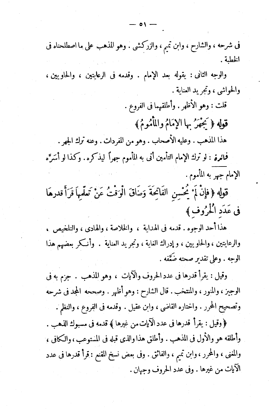قَوْلُهُ (فَإِنْ لَمْ يُحْسِنْ الْفَاتِحَةَ وَضَاقَ الْوَقْتُ عَنْ تَعَلُّمِهَا قَرَأَ قَدْرَهَا فِي عَدَدِ الْحُرُوفِ) هَذَا أَحَدُ الْوُجُوهِ قَدَّمَهُ فِي الْهِدَايَةِ، وَالْخُلَاصَةِ، وَالْهَادِي، وَالتَّلْخِيصِ، وَالرِّعَايَتَيْنِ، وَالْحَاوِيَيْنِ، وَإِدْرَاكِ الْغَايَةِ، وَتَجْرِيدِ الْعِنَايَةِ، وَأَنْكَرَ بَعْضُهُمْ هَذَا الْوَجْهَ، وَعَلَى تَقْدِيرِ صِحَّتِهِ ضَعَّفَهُ، وَقِيلَ: يَقْرَأُ قَدْرَهَا فِي عَدَدِ الْحُرُوفِ وَالْآيَاتِ، وَهُوَ الْمَذْهَبُ جَزَمَ بِهِ فِي الْوَجِيزِ، وَالْمُنَوِّرِ، وَالْمُنْتَخَبِ. قَالَ الشَّارِحُ: وَهُوَ أَظْهَرُ وَصَحَّحَهُ الْمَجْدُ فِي شَرْحِهِ وَتَصْحِيحِ الْمُحَرَّرِ وَاخْتَارَهُ الْقَاضِي، وَابْنُ عَقِيلٍ وَقَدَّمَهُ فِي الْفُرُوعِ، وَالنَّظْمِ.