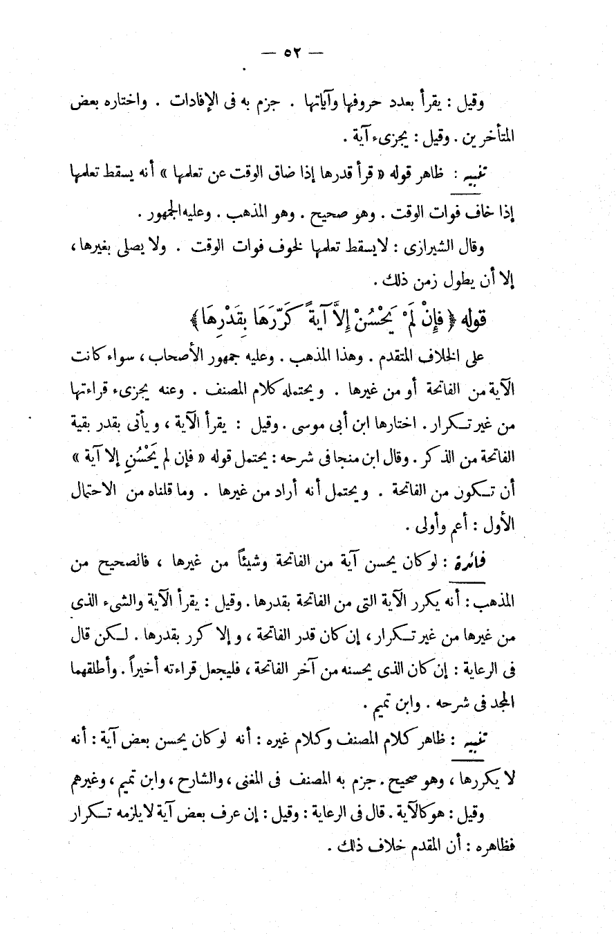 تَنْبِيهٌ: ظَاهِرُ كَلَامِ الْمُصَنِّفِ وَكَلَامِ غَيْرِهِ: أَنَّهُ لَوْ كَانَ يُحْسِنُ بَعْضَ آيَةٍ: أَنَّهُ لَا يُكَرِّرُهَا، وَهُوَ صَحِيحٌ، جَزَمَ بِهِ الْمُصَنِّفُ فِي الْمُغْنِي، وَالشَّارِحُ، وَابْنُ تَمِيمٍ، وَغَيْرُهُمْ وَقِيلَ: هُوَ كَالْآيَةِ قَالَ فِي الرِّعَايَةِ: وَقِيلَ: إنْ عَرَفَ بَعْضَ آيَةٍ لَا يَلْزَمُهُ تَكْرَارٌ فَظَاهِرُهُ: أَنَّ الْمُقَدَّمَ خِلَافُ ذَلِكَ.