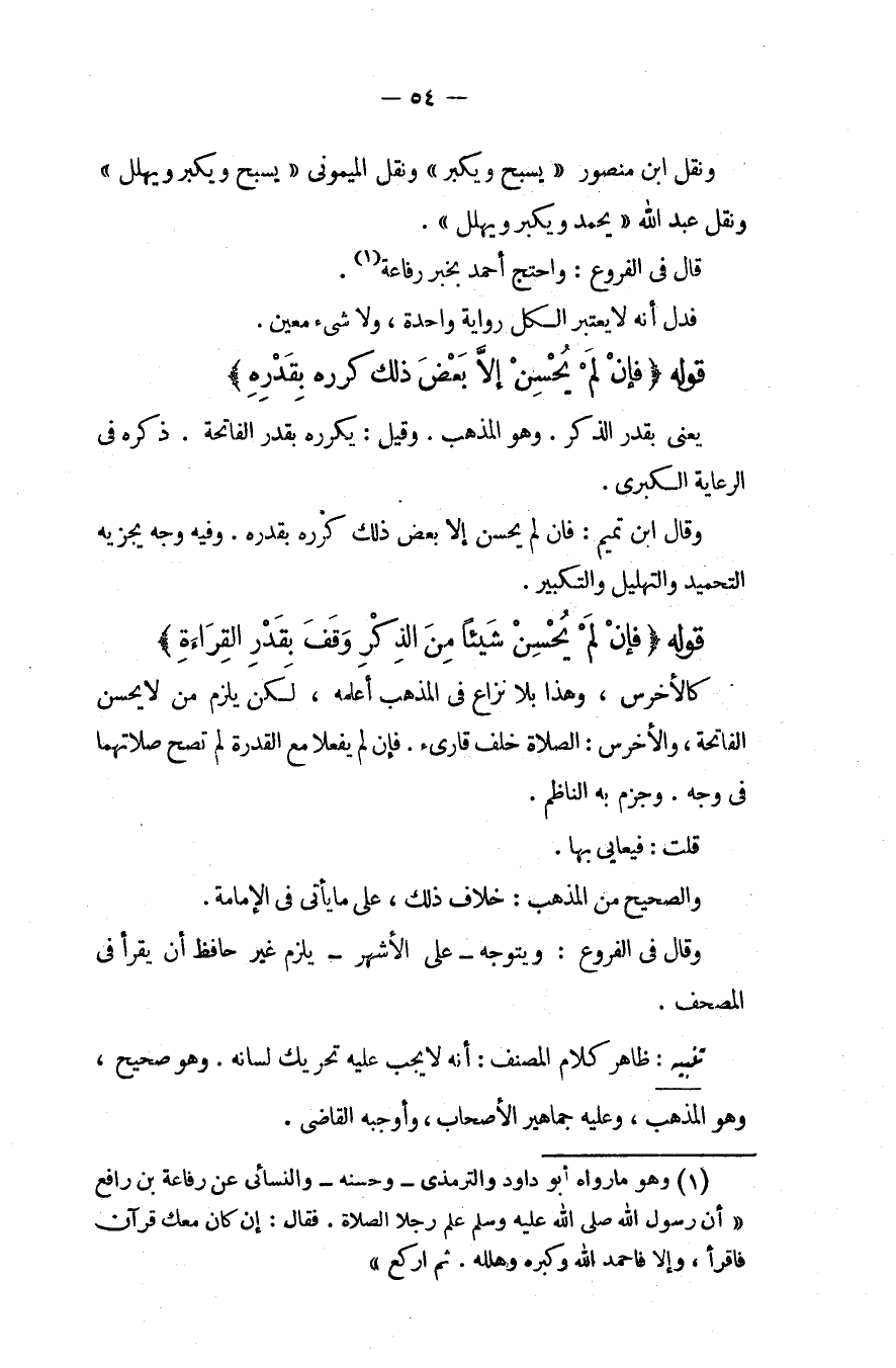 وَنَقَلَ ابْنُ مَنْصُورٍ يُسَبِّحُ وَيُكَبِّرُ وَنَقَلَ الْمَيْمُونِيُّ يُسَبِّحُ وَيُكَبِّرُ وَيُهَلِّلُ وَنَقَلَ عَبْدُ اللَّهِ يُحَمِّدُ وَيُكَبِّرُ وَيُهَلِّلُ. قَالَ فِي الْفُرُوعِ: وَاحْتَجَّ أَحْمَدُ بِخَبَرِ رِفَاعَةَ فَدَلَّ أَنَّهُ لَا يَعْتَبِرُ الْكُلَّ رِوَايَةً وَاحِدَةً، وَلَا شَيْءَ مُعَيَّنٌ. قَوْلُهُ (فَإِنْ لَمْ يُحْسِنْ إلَّا بَعْضَ ذَلِكَ كَرَّرَهُ بِقَدْرِهِ) يَعْنِي بِقَدْرِ الذِّكْرِ، وَهُوَ الْمَذْهَبُ وَقِيلَ: يُكَرِّرُهُ بِقَدْرِ الْفَاتِحَةِ، ذَكَرَهُ فِي الرِّعَايَةِ الْكُبْرَى، وَقَالَ ابْنُ تَمِيمٍ: فَإِنْ لَمْ يُحْسِنْ إلَّا بَعْضَ ذَلِكَ كَرَّرَهُ بِقَدْرِهِ، وَفِيهِ وَجْهٌ يُجْزِيهِ التَّحْمِيدُ وَالتَّهْلِيلُ وَالتَّكْبِيرُ.