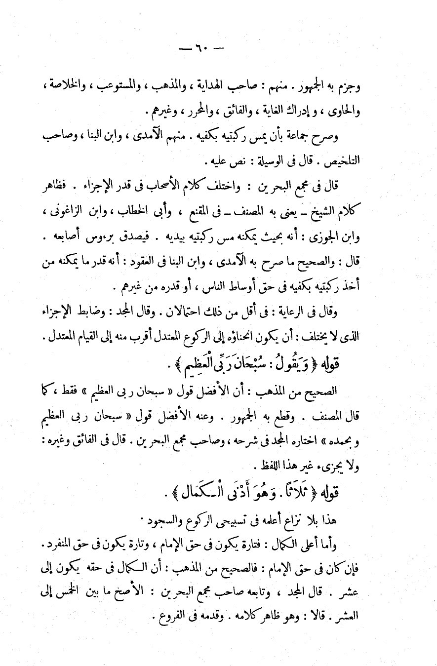 وَجَزَمَ بِهِ الْجُمْهُورُ. مِنْهُمْ: صَاحِبُ الْهِدَايَةِ، وَالْمُذْهَبِ، وَالْمُسْتَوْعِبِ، وَالْخُلَاصَةِ، وَالْحَاوِي، وَإِدْرَاكِ الْغَايَةِ، وَالْفَائِقِ، وَالْمُحَرَّرِ، وَغَيْرُهُمْ. وَصَرَّحَ جَمَاعَةٌ بِأَنْ يَمَسَّ رُكْبَتَيْهِ بِكَفَّيْهِ، مِنْهُمْ الْآمِدِيُّ، وَابْنُ الْبَنَّا، وَصَاحِبُ التَّلْخِيصِ قَالَ فِي الْوَسِيلَةِ: نَصَّ عَلَيْهِ قَالَ فِي مَجْمَعِ الْبَحْرَيْنِ: وَاخْتَلَفَ كَلَامُ الْأَصْحَابِ فِي قَدْرِ الْإِجْزَاءِ فَظَاهِرُ كَلَامِ الشَّيْخِ يَعْنِي بِهِ الْمُصَنِّفَ فِي الْمُقْنِعِ، وَأَبِي الْخَطَّابِ، وَابْنُ الزَّاغُونِيِّ، وَابْنُ الْجَوْزِيِّ: أَنَّهُ بِحَيْثُ يُمْكِنُهُ مَسُّ رُكْبَتَيْهِ بِيَدَيْهِ. فَيَصْدُقُ بِرُءُوسِ أَصَابِعِهِ قَالَ: وَالصَّحِيحُ مَا صَرَّحَ بِهِ الْآمِدِيُّ، وَابْنُ الْبَنَّا فِي الْعُقُودِ: أَنَّهُ قَدْرُ مَا يُمْكِنُهُ مِنْ أَخْذِ رُكْبَتَيْهِ بِكَفَّيْهِ فِي حَقِّ أَوْسَاطِ النَّاسِ، أَوْ قَدْرُهُ مِنْ غَيْرِهِمْ. وَقَالَ فِي الرِّعَايَةِ: فِي أَقَلَّ مِنْ ذَلِكَ احْتِمَالَانِ، وَقَالَ الْمَجْدُ: وَضَابِطُ الْإِجْزَاءِ الَّذِي لَا يَخْتَلِفُ: أَنْ يَكُونَ انْحِنَاؤُهُ إلَى الرُّكُوعِ الْمُعْتَدِلِ أَقْرَبَ مِنْهُ إلَى الْقِيَامِ الْمُعْتَدِلِ.