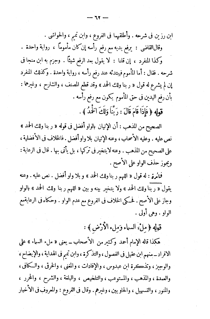 ابْنُ رَزِينٍ فِي شَرْحِهِ، وَأَطْلَقَهُمَا فِي الْفُرُوعِ، وَابْنُ تَمِيمٍ، وَالْحَوَاشِي، وَقَالَ الْقَاضِي: يَرْفَعُ يَدَيْهِ مَعَ رَفْعِ رَأْسِهِ إنْ كَانَ مَأْمُومًا، رِوَايَةً وَاحِدَةً. وَكَذَا الْمُنْفَرِدُ، إنْ قُلْنَا: لَا يَقُولُ بَعْدَ الرَّفْعِ شَيْئًا وَجَزَمَ بِهِ ابْنُ مُنَجَّى فِي شَرْحِهِ فَقَالَ: أَمَّا الْمَأْمُومُ فَيَبْتَدِئُهُ عِنْدَ رَفْعِ رَأْسِهِ، رِوَايَةً وَاحِدَةً، وَكَذَلِكَ الْمُنْفَرِدُ إنْ لَمْ يُشْرَعْ لَهُ قَوْلُ رَبَّنَا وَلَك الْحَمْدُ وَقَدْ قَطَعَ الْمُصَنِّفُ، وَالشَّارِحُ، وَغَيْرُهُمَا: بِأَنَّ رَفْعَ الْيَدَيْنِ فِي حَقِّ الْمَأْمُومِ يَكُونُ مَعَ رَفْعِ رَأْسِهِ.