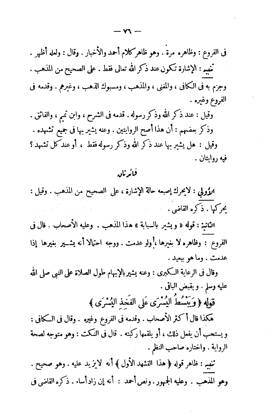 فَائِدَتَانِ. الْأُولَى: لَا يُحَرِّكُ إصْبَعَهُ حَالَةَ الْإِشَارَةِ، عَلَى الصَّحِيحِ مِنْ الْمَذْهَبِ، وَقِيلَ: يُحَرِّكُهَا، ذَكَرَهُ الْقَاضِي، الثَّانِيَةُ: قَوْلُهُ وَيُشِيرُ بِالسَّبَّابَةِ هَذَا الْمَذْهَبُ، وَعَلَيْهِ الْأَصْحَابُ قَالَ فِي الْفُرُوعِ: وَظَاهِرُهُ لَا بِغَيْرِهَا، لَوْ عُدِمَتْ. وَوُجِّهَ احْتِمَالًا أَنَّهُ يُشِيرُ بِغَيْرِهَا إذَا عُدِمَتْ، وَمَا هُوَ بِبَعِيدٍ، وَقَالَ فِي الرِّعَايَةِ الْكُبْرَى: وَعَنْهُ يُشِيرُ بِالْإِبْهَامِ طُولَ الصَّلَاةِ عَلَى النَّبِيِّ - صَلَّى اللَّهُ عَلَيْهِ وَسَلَّمَ - وَيَقْبِضُ الْبَاقِيَ.
