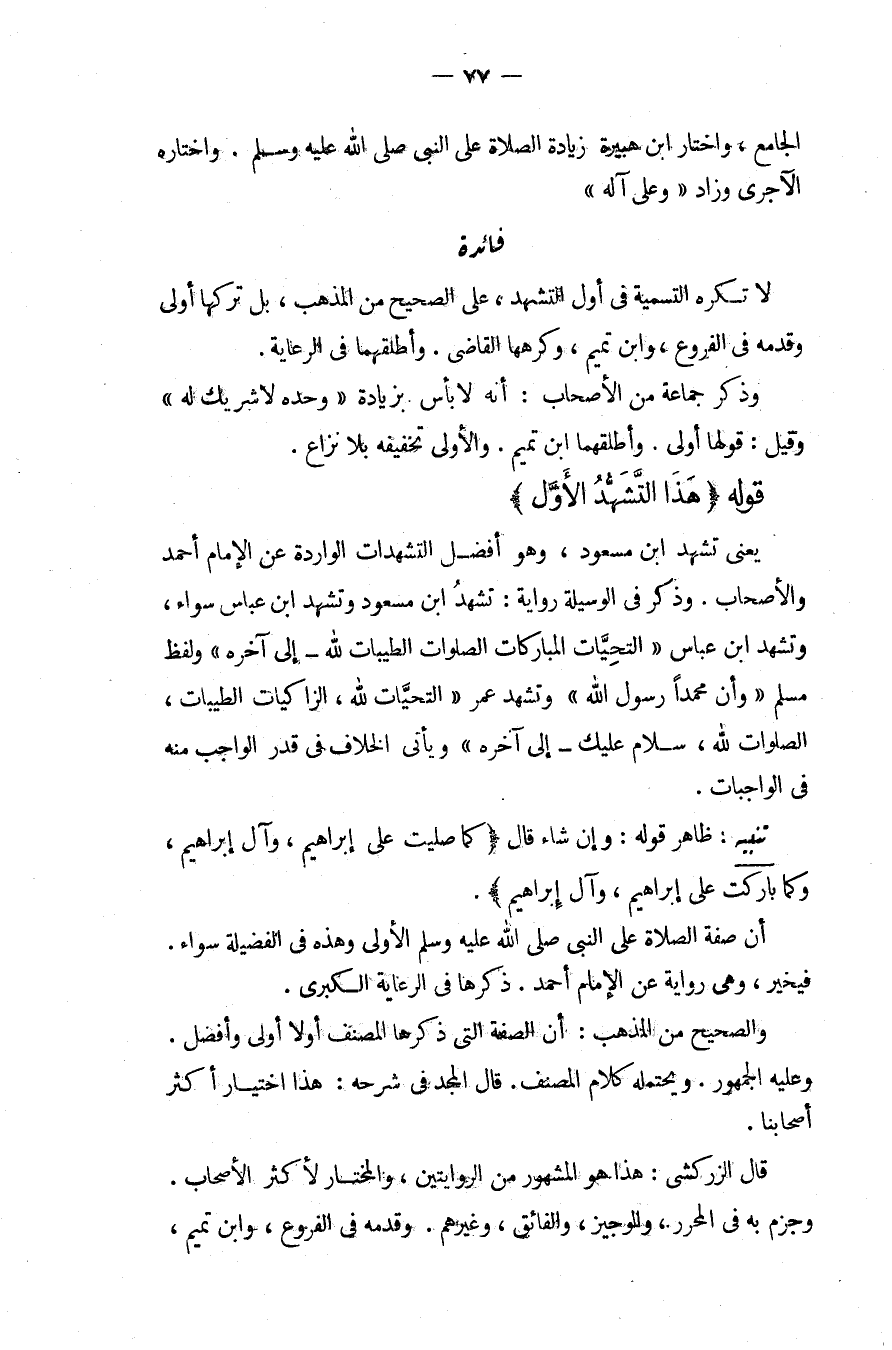 فَائِدَةٌ. لَا تُكْرَهُ التَّسْمِيَةُ فِي أَوَّلِ التَّشَهُّدِ، عَلَى الصَّحِيحِ مِنْ الْمَذْهَبِ، بَلْ تَرْكُهَا أَوْلَى وَقَدَّمَهُ فِي الْفُرُوعِ، وَابْنُ تَمِيمٍ، وَكَرِهَهَا الْقَاضِي. وَأَطْلَقَهُمَا فِي الرِّعَايَةِ، وَذَكَرَ جَمَاعَةٌ مِنْ الْأَصْحَابِ: أَنَّهُ لَا بَأْسَ بِزِيَادَةِ وَحْدَهُ لَا شَرِيكَ لَهُ وَقِيلَ: قَوْلُهَا أَوْلَى، وَأَطْلَقَهُمَا ابْنُ تَمِيمٍ. وَالْأَوْلَى تَخْفِيفُهُ بِلَا نِزَاعٍ. قَوْلُهُ (هَذَا التَّشَهُّدُ الْأَوَّلُ) يَعْنِي تَشَهُّدَ ابْنِ مَسْعُودٍ، وَهُوَ أَفْضَلُ التَّشَهُّدَاتِ الْوَارِدَةِ عَنْ الْإِمَامِ أَحْمَدَ وَالْأَصْحَابِ، وَذَكَرَ فِي الْوَسِيلَةِ رِوَايَةً: تَشَهُّدُ ابْنِ مَسْعُودٍ وَتَشَهُّدُ ابْنِ عَبَّاسٍ سَوَاءٌ، وَتَشَهُّدُ ابْنِ عَبَّاسٍ التَّحِيَّاتُ الْمُبَارَكَاتُ الصَّلَوَاتُ الطَّيِّبَاتُ لِلَّهِ إلَى آخِرِهِ وَلَفْظُ مُسْلِمٍ وَأَنَّ مُحَمَّدًا رَسُولُ اللَّهِ وَتَشَهُّدُ عُمَرَ التَّحِيَّاتُ لِلَّهِ، الزَّاكِيَاتُ الطَّيِّبَاتُ، الصَّلَوَاتُ لِلَّهِ، سَلَامُ عَلَيْك إلَى آخِرِهِ وَيَأْتِي الْخِلَافُ فِي قَدْرِ الْوَاجِبِ مِنْهُ فِي الْوَاجِبَاتِ.