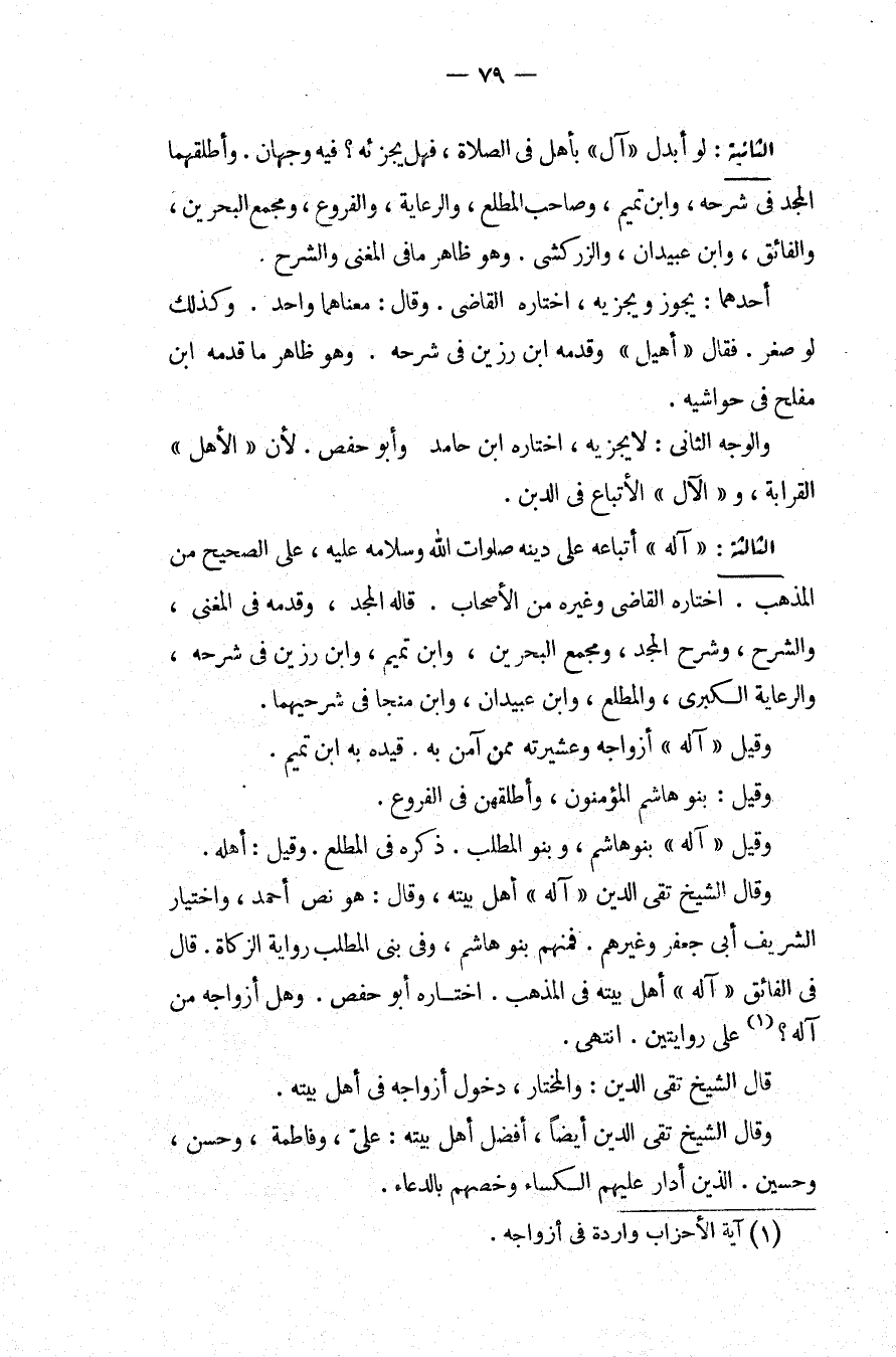 الثَّالِثَةُ: آلُهُ أَتْبَاعُهُ عَلَى دِينِهِ - صَلَوَاتُ اللَّهِ وَسَلَامُهُ عَلَيْهِ -، عَلَى الصَّحِيحِ مِنْ الْمَذْهَبِ اخْتَارَهُ الْقَاضِي وَغَيْرُهُ مِنْ الْأَصْحَابِ، قَالَهُ الْمَجْدُ، وَقَدَّمَهُ فِي الْمُغْنِي، وَالشَّرْحِ، وَشَرْحِ الْمَجْدِ، وَمَجْمَعِ الْبَحْرَيْنِ، وَابْنُ تَمِيمٍ، وَابْنُ رَزِينٍ فِي شَرْحِهِ، وَالرِّعَايَةِ الْكُبْرَى، وَالْمَطْلَعِ، وَابْنُ عُبَيْدَانِ، وَابْنُ مُنَجَّى فِي شَرْحَيْهِمَا، وَقِيلَ آلُهُ أَزْوَاجُهُ وَعَشِيرَتُهُ مِمَّنْ آمَنَ بِهِ قَيَّدَهُ بِهِ ابْنُ تَمِيمٍ، وَقِيلَ: بَنُو هَاشِمٍ الْمُؤْمِنُونَ، وَأَطْلَقَهُنَّ فِي الْفُرُوعِ، وَقِيلَ آلُهُ بَنُو هَاشِمٍ، وَبَنُو الْمُطَّلِبِ، ذَكَرَهُ فِي الْمَطْلَعِ. وَقِيلَ: أَهْلُهُ، وَقَالَ الشَّيْخُ تَقِيُّ الدِّينِ آلُهُ أَهْلُ بَيْتِهِ، وَقَالَ: هُوَ نَصُّ أَحْمَدَ، وَاخْتِيَارُ الشَّرِيفِ أَبِي جَعْفَرٍ وَغَيْرِهِمْ فَمِنْهُمْ بَنُو هَاشِمٍ، وَفِي بَنِي الْمُطَّلِبِ رِوَايَةُ الزَّكَاةِ قَالَ فِي الْفَائِقِ آلُهُ أَهْلُ بَيْتِهِ فِي الْمَذْهَبِ اخْتَارَهُ أَبُو حَفْصٍ، وَهَلْ أَزْوَاجُهُ مِنْ آلِهِ؟ عَلَى رِوَايَتَيْنِ. انْتَهَى.