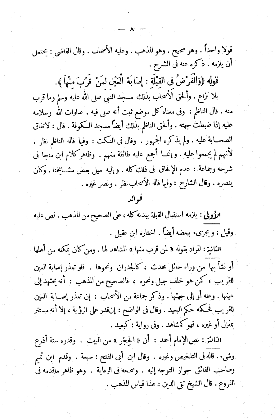 فَوَائِدُ. الْأُولَى: يَلْزَمُهُ اسْتِقْبَالُ الْقِبْلَةِ بِبَدَنِهِ كُلِّهِ، عَلَى الصَّحِيحِ مِنْ الْمَذْهَبِ نَصَّ عَلَيْهِ وَقِيلَ: وَيُجْزِئُ بِبَعْضِهِ أَيْضًا اخْتَارَهُ ابْنُ عَقِيلٍ، الثَّانِيَةُ: الْمُرَادُ بِقَوْلِهِ " لِمَنْ قَرُبَ مِنْهَا " الْمُشَاهِدُ لَهَا. وَمَنْ كَانَ يُمْكِنُهُ مِنْ أَهْلِهَا أَوْ نَشَأَ بِهَا مِنْ وَرَاءِ حَائِلٍ مُحْدَثٍ، كَالْجُدْرَانِ وَنَحْوِهَا فَلَوْ تَعَذَّرَ إصَابَةُ الْعَيْنِ لِلْقَرِيبِ، كَمَنْ هُوَ خَلْفَ جَبَلٍ وَنَحْوِهِ، فَالصَّحِيحُ مِنْ الْمَذْهَبِ: أَنَّهُ يَجْتَهِدُ إلَى عَيْنِهَا. وَعَنْهُ أَوْ إلَى جِهَتِهَا، وَذَكَرَ جَمَاعَةٌ مِنْ الْأَصْحَابِ: إنْ تَعَذَّرَ إصَابَةُ الْعَيْنِ لِلْقَرِيبِ فَحُكْمُهُ حُكْمُ الْبَعِيدِ، وَقَالَ فِي الْوَاضِحِ: إنْ قَدَرَ عَلَى الرُّؤْيَةِ، إلَّا أَنَّهُ مُسْتَتِرٌ بِمَنْزِلٍ أَوْ غَيْرِهِ، فَهُوَ كَمُشَاهِدٍ، وَفِي رِوَايَةٍ: كَبَعِيدٍ.