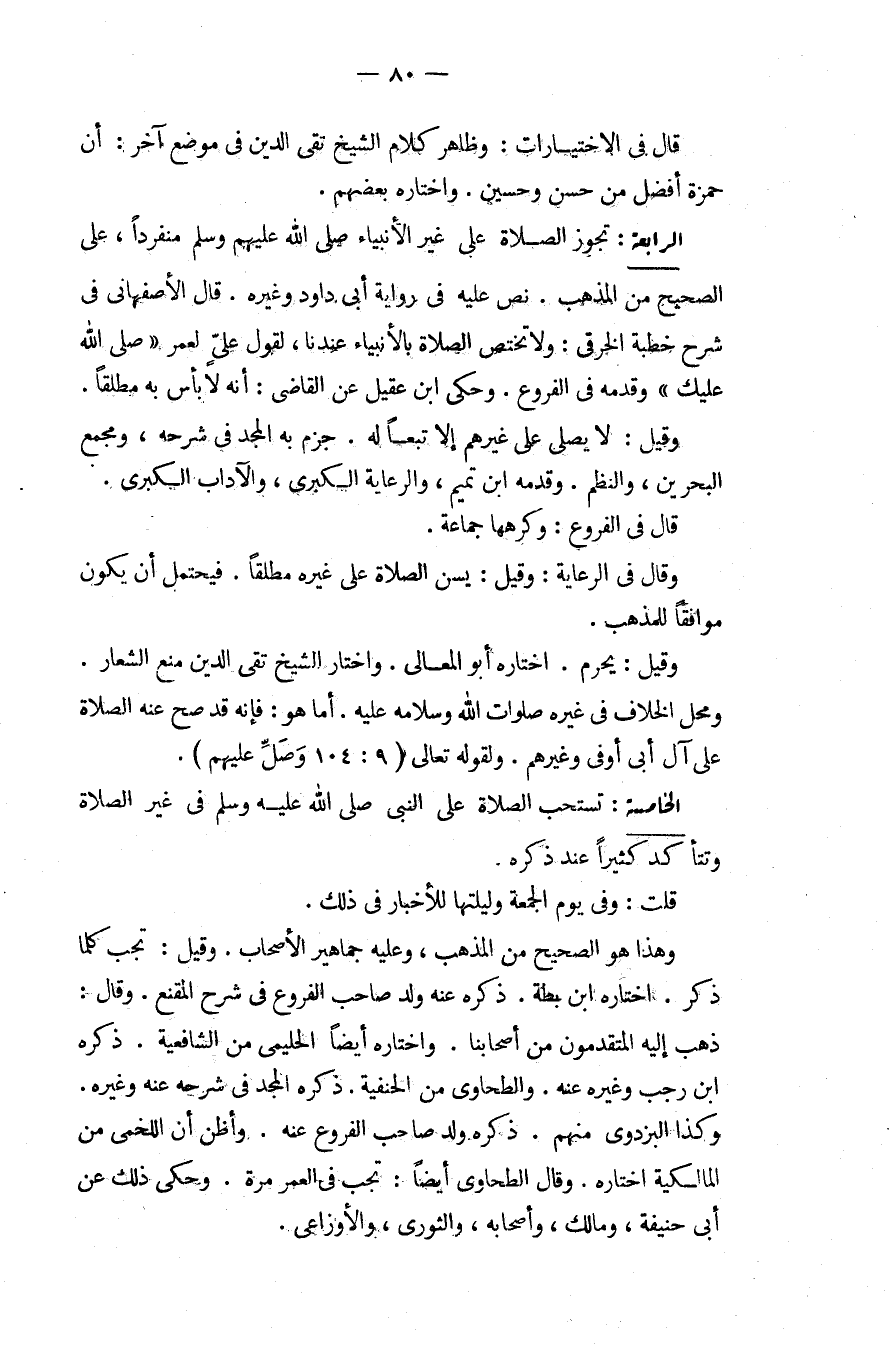 الْخَامِسَةُ: تُسْتَحَبُّ الصَّلَاةُ عَلَى النَّبِيِّ - صَلَّى اللَّهُ عَلَيْهِ وَسَلَّمَ - فِي غَيْرِ الصَّلَاةِ وَتَتَأَكَّدُ كَثِيرًا عِنْدَ ذِكْرِهِ. قُلْت: وَفِي يَوْمِ الْجُمُعَةِ وَلَيْلَتِهَا لِلْأَخْبَارِ فِي ذَلِكَ، وَهَذَا هُوَ الصَّحِيحُ مِنْ الْمَذْهَبِ، وَعَلَيْهِ جَمَاهِيرُ الْأَصْحَابِ. وَقِيلَ: تَجِبُ كُلَّمَا ذُكِرَ اخْتَارَهُ ابْنُ بَطَّةَ، ذَكَرَهُ عَنْهُ وَلَدُ صَاحِبِ الْفُرُوعِ فِي شَرْحِ الْمُقْنِعِ، وَقَالَ: ذَهَبَ إلَيْهِ الْمُتَقَدِّمُونَ مِنْ أَصْحَابِنَا. وَاخْتَارَهُ أَيْضًا الْحَلِيمِيُّ مِنْ الشَّافِعِيَّةِ، ذَكَرَهُ ابْنُ رَجَبٍ وَغَيْرُهُ عَنْهُ. وَالطَّحَاوِيُّ مِنْ الْحَنَفِيَّةِ، ذَكَرَهُ الْمَجْدُ فِي شَرْحِهِ عَنْهُ وَغَيْرُهُ، وَكَذَا الْبَزْدَوِيُّ مِنْهُمْ، ذَكَرَهُ وَلَدُ صَاحِبِ الْفُرُوعِ عَنْهُ، وَأَظُنُّ أَنَّ اللَّخْمِيَّ مِنْ الْمَالِكِيَّةِ اخْتَارَهُ، وَقَالَ الطَّحَاوِيُّ أَيْضًا: تَجِبُ فِي الْعُمُرِ مَرَّةً. وَحَكَى ذَلِكَ عَنْ أَبِي حَنِيفَةَ، وَمَالِكٍ، وَأَصْحَابِهِ، وَالثَّوْرِيِّ، وَالْأَوْزَاعِيِّ
