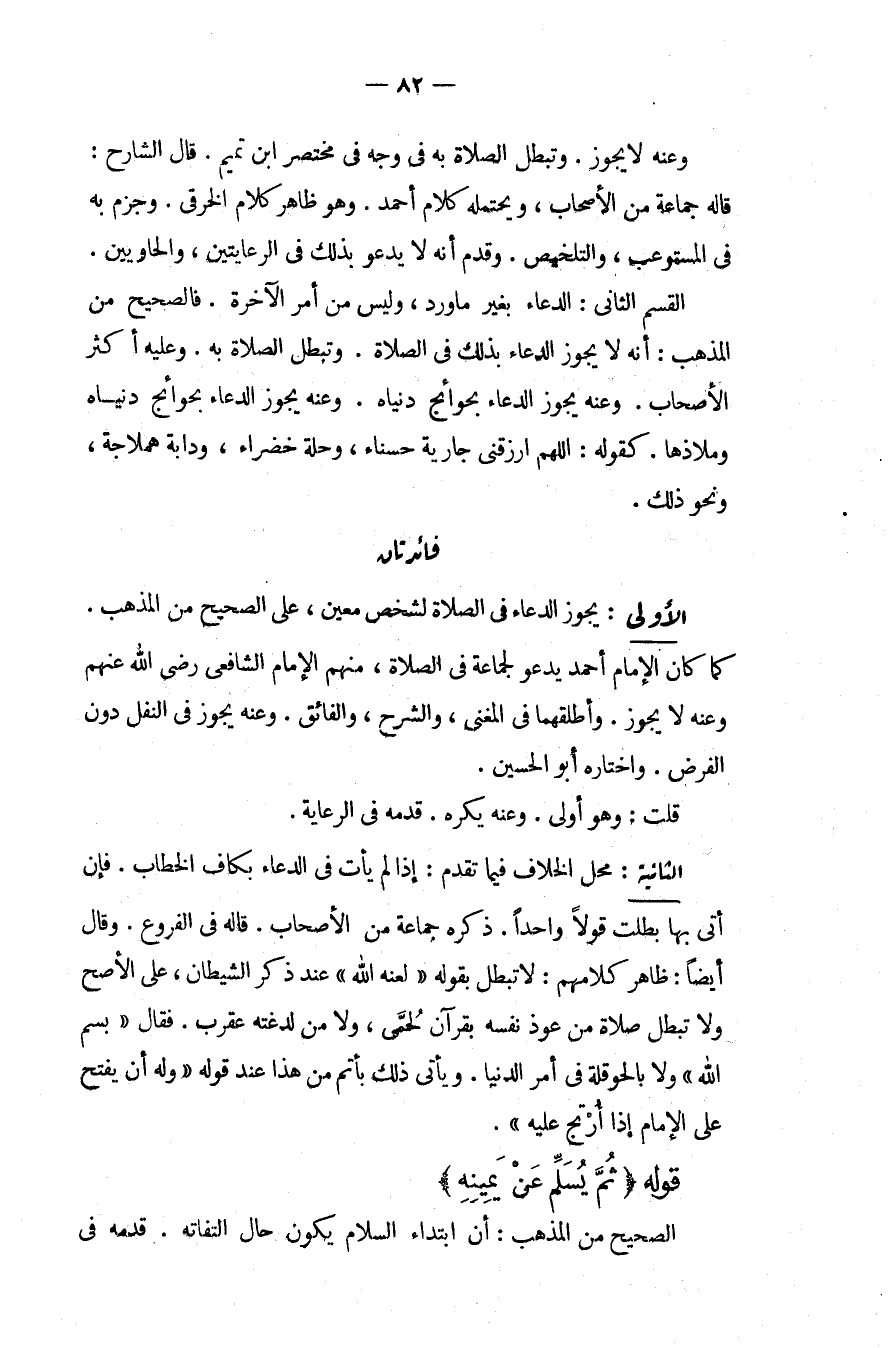 وَعَنْهُ لَا يَجُوزُ، وَتَبْطُلُ الصَّلَاةُ بِهِ فِي وَجْهٍ فِي مُخْتَصَرِ ابْنِ تَمِيمٍ قَالَ الشَّارِحُ: قَالَهُ جَمَاعَةٌ مِنْ الْأَصْحَابِ، وَيَحْتَمِلُهُ كَلَامُ أَحْمَدَ، وَهُوَ ظَاهِرُ كَلَامِ الْخِرَقِيِّ وَجَزَمَ بِهِ فِي الْمُسْتَوْعِبِ، وَالتَّلْخِيصِ وَقَدَّمَ أَنَّهُ لَا يَدْعُو بِذَلِكَ فِي الرِّعَايَتَيْنِ، وَالْحَاوِيَيْنِ، الْقِسْمُ الثَّانِي: الدُّعَاءُ بِغَيْرِ مَا وَرَدَ، وَلَيْسَ مِنْ أَمْرِ الْآخِرَةِ فَالصَّحِيحُ مِنْ الْمَذْهَبِ: أَنَّهُ لَا يَجُوزُ الدُّعَاءُ بِذَلِكَ فِي الصَّلَاةِ، وَتَبْطُلُ الصَّلَاةُ بِهِ. وَعَلَيْهِ أَكْثَرُ الْأَصْحَابِ، وَعَنْهُ يَجُوزُ الدُّعَاءُ بِحَوَائِجِ دُنْيَاهُ، وَعَنْهُ يَجُوزُ الدُّعَاءُ بِحَوَائِجِ دُنْيَاهُ وَمَلَّاذِهَا. كَقَوْلِهِ: اللَّهُمَّ اُرْزُقْنِي جَارِيَةً حَسْنَاءَ، وَحُلَّةً خَضْرَاءَ، وَدَابَّةً هِمْلَاجَةً، وَنَحْوَ ذَلِكَ.