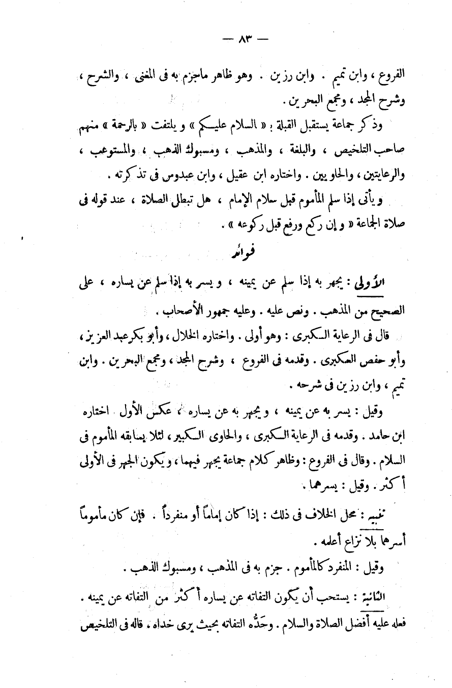 الْفُرُوعِ، وَابْنُ تَمِيمٍ، وَابْنُ رَزِينٍ، وَهُوَ ظَاهِرُ مَا جَزَمَ بِهِ فِي الْمُغْنِي، وَالشَّرْحِ، وَشَرْحِ الْمَجْدِ، وَمَجْمَعِ الْبَحْرَيْنِ، وَذَكَرَ جَمَاعَةٌ يَسْتَقْبِلُ الْقِبْلَةَ السَّلَامُ عَلَيْكُمْ وَيَلْتَفِتُ بِالرَّحْمَةِ مِنْهُمْ صَاحِبُ التَّلْخِيصِ، وَالْبُلْغَةِ، وَالْمُذْهَبِ، وَمَسْبُوكِ الذَّهَبِ، وَالْمُسْتَوْعِبِ، وَالرِّعَايَتَيْنِ، وَالْحَاوِيَيْنِ وَاخْتَارَهُ ابْنُ عَقِيلٍ، وَابْنُ عَبْدُوسٍ فِي تَذْكِرَتِهِ، وَيَأْتِي إذَا سَلَّمَ الْمَأْمُومُ قَبْلَ سَلَامِ الْإِمَامِ، هَلْ تَبْطُلُ الصَّلَاةُ، عِنْدَ قَوْلِهِ فِي صَلَاةِ الْجَمَاعَةِ وَإِنْ رَكَعَ وَرَفَعَ قَبْلَ رُكُوعِهِ.
