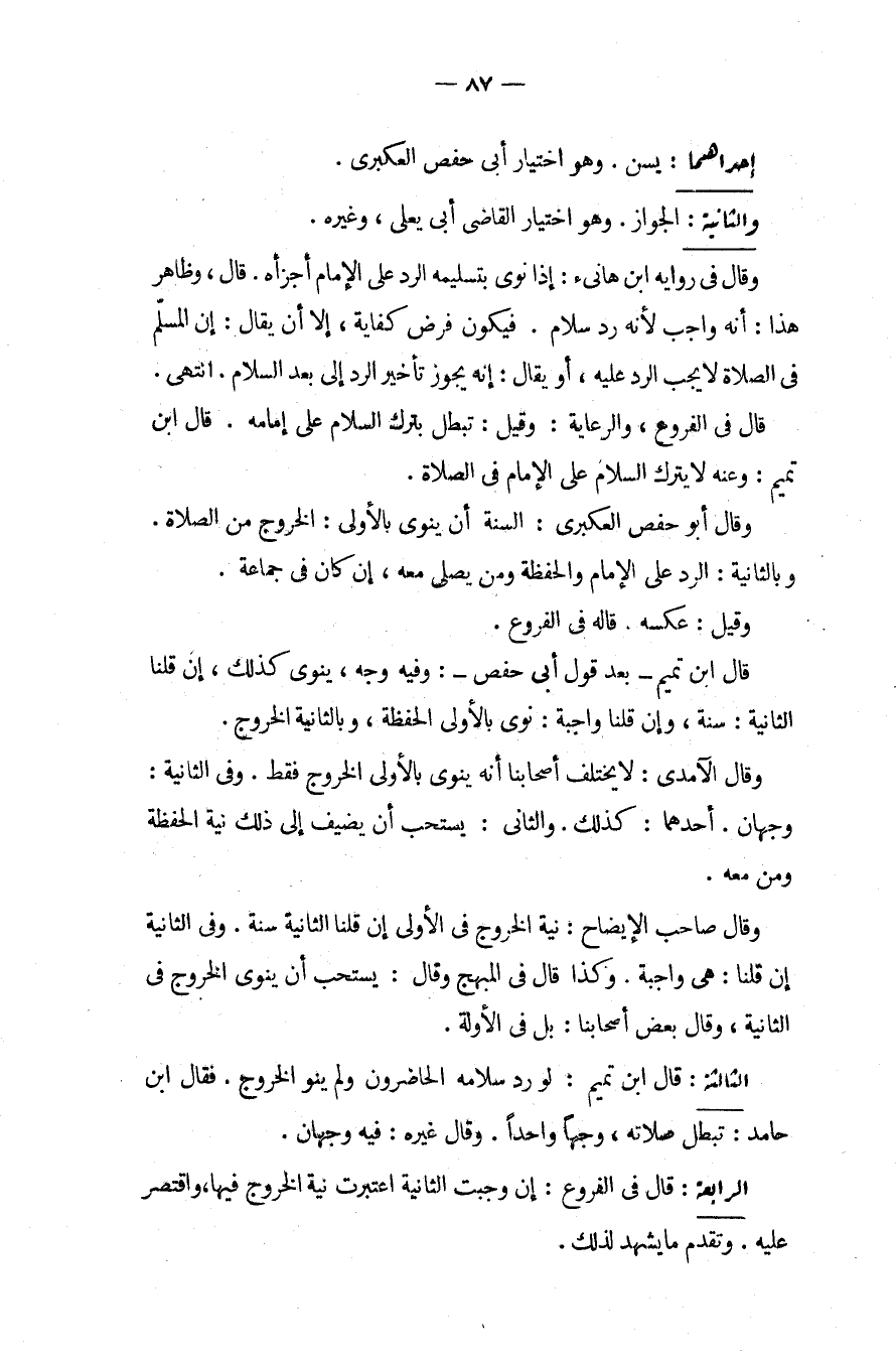الثَّالِثَةُ: قَالَ ابْنُ تَمِيمٍ: لَوْ رَدَّ سَلَامَهُ الْحَاضِرُونَ وَلَمْ يَنْوِ الْخُرُوجَ فَقَالَ ابْنُ حَامِدٍ: تَبْطُلُ صَلَاتُهُ، وَجْهًا وَاحِدًا، وَقَالَ غَيْرُهُ: فِيهِ وَجْهَانِ الرَّابِعَةُ: قَالَ فِي الْفُرُوعِ: إنْ وَجَبَتْ الثَّانِيَةُ اُعْتُبِرَتْ نِيَّةُ الْخُرُوجُ فِيهَا، وَاقْتَصَرَ عَلَيْهِ، وَتَقَدَّمَ مَا يَشْهَدُ لِذَلِكَ
