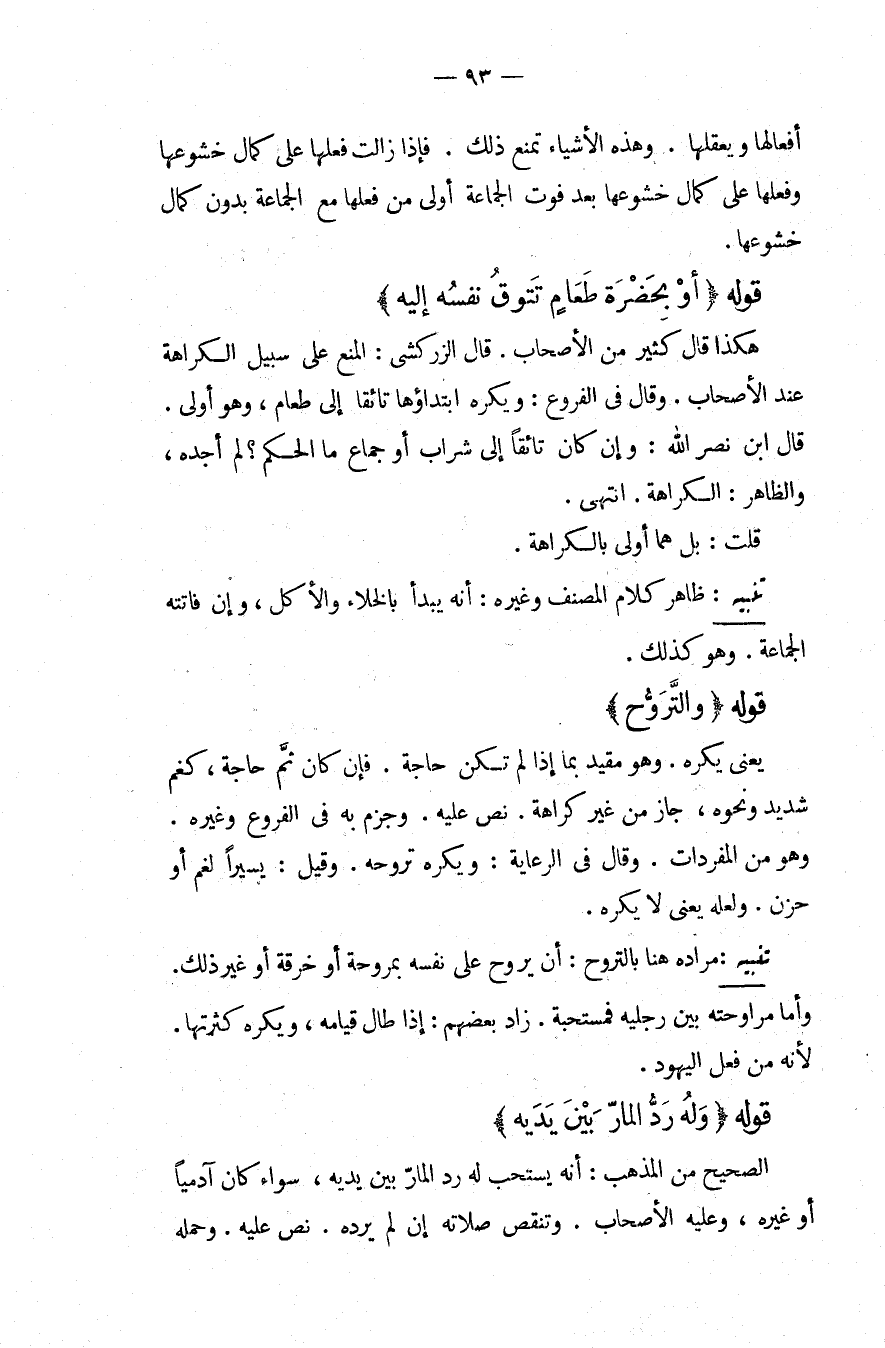 أَفْعَالَهَا وَيَعْقِلَهَا، وَهَذِهِ الْأَشْيَاءُ تَمْنَعُ ذَلِكَ فَإِذَا زَالَتْ فَعَلَهَا عَلَى كَمَالِ خُشُوعِهَا وَفِعْلُهَا عَلَى كَمَالِ خُشُوعِهَا بَعْدَ فَوْتِ الْجَمَاعَةِ أَوْلَى مِنْ فِعْلِهَا مَعَ الْجَمَاعَةِ بِدُونِ كَمَالِ خُشُوعِهَا. قَوْلُهُ (أَوْ بِحَضْرَةِ طَعَامٍ تَتُوقُ نَفْسُهُ إلَيْهِ) هَكَذَا قَالَ كَثِيرٌ مِنْ الْأَصْحَابِ قَالَ الزَّرْكَشِيُّ: الْمَنْعُ عَلَى سَبِيلِ الْكَرَاهَةِ عِنْدَ الْأَصْحَابِ، وَقَالَ فِي الْفُرُوعِ: وَيُكْرَهُ ابْتِدَاؤُهَا تَائِقًا إلَى الطَّعَامِ، وَهُوَ أَوْلَى قَالَ ابْنُ نَصْرِ اللَّهِ: وَإِنْ كَانَ تَائِقًا إلَى شَرَابٍ أَوْ جِمَاعٍ مَا الْحُكْمُ؟ لَمْ أَجِدْهُ، وَالظَّاهِرُ: الْكَرَاهَةُ. انْتَهَى. قُلْت: بَلْ هُمَا أَوْلَى بِالْكَرَاهَةِ.