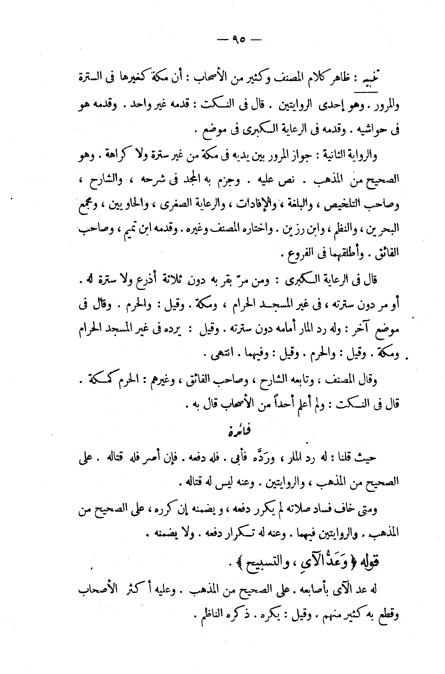تَنْبِيهٌ: ظَاهِرُ كَلَامِ الْمُصَنِّفِ وَكَثِيرٍ مِنْ الْأَصْحَابِ: أَنَّ مَكَّةَ كَغَيْرِهَا فِي السُّتْرَةِ وَالْمُرُورِ، وَهُوَ إحْدَى الرِّوَايَتَيْنِ قَالَ فِي النُّكَتِ: قَدَّمَهُ غَيْرُ وَاحِدٍ وَقَدَّمَهُ هُوَ فِي حَوَاشِيهِ وَقَدَّمَهُ فِي الرِّعَايَةِ الْكُبْرَى فِي مَوْضِعٍ، وَالرِّوَايَةُ الثَّانِيَةُ: جَوَازُ الْمُرُورِ بَيْنَ يَدَيْهِ فِي مَكَّةَ مِنْ غَيْرِ سُتْرَةٍ وَلَا كَرَاهَةَ، وَهُوَ الصَّحِيحُ مِنْ الْمَذْهَبِ نَصَّ عَلَيْهِ وَجَزَمَ بِهِ الْمَجْدُ فِي شَرْحِهِ، وَالشَّارِحُ، وَصَاحِبُ التَّلْخِيصِ، وَالْبُلْغَةِ، وَالْإِفَادَاتِ، وَالرِّعَايَةِ الصُّغْرَى، وَالْحَاوِيَيْنِ، وَمَجْمَعِ الْبَحْرَيْنِ، وَالنَّظْمِ، وَابْنُ رَزِينٍ وَاخْتَارَهُ الْمُصَنِّفُ وَغَيْرُهُ وَقَدَّمَهُ ابْنُ تَمِيمٍ، وَصَاحِبُ الْفَائِقِ، وَأَطْلَقَهُمَا فِي الْفُرُوعِ قَالَ فِي الرِّعَايَةِ الْكُبْرَى: وَمَنْ مَرَّ بِقُرْبِهِ دُونَ ثَلَاثَةِ أَذْرُعٍ وَلَا سُتْرَةَ لَهُ أَوْ مَرَّ دُونَ سُتْرَتِهِ، فِي غَيْرِ الْمَسْجِدِ الْحَرَامِ، وَمَكَّةَ، وَقِيلَ: وَالْحَرَمِ، وَقَالَ فِي مَوْضِعٍ آخَرَ: وَلَهُ رَدُّ الْمَارِّ أَمَامَهُ دُونَ سُتْرَتِهِ، وَقِيلَ: يَرُدُّهُ فِي غَيْرِ الْمَسْجِدِ الْحَرَامِ وَمَكَّةَ، وَقِيلَ: وَالْحَرَمِ، وَقِيلَ: وَفِيهِمَا. انْتَهَى. وَقَالَ الْمُصَنِّفُ، وَتَابَعَهُ الشَّارِحُ، وَصَاحِبُ الْفَائِقِ، وَغَيْرُهُمْ: الْحَرَمُ كَمَكَّةَ قَالَ فِي النُّكَتِ: وَلَمْ أَعْلَمْ أَحَدًا مِنْ الْأَصْحَابِ قَالَ بِهِ.