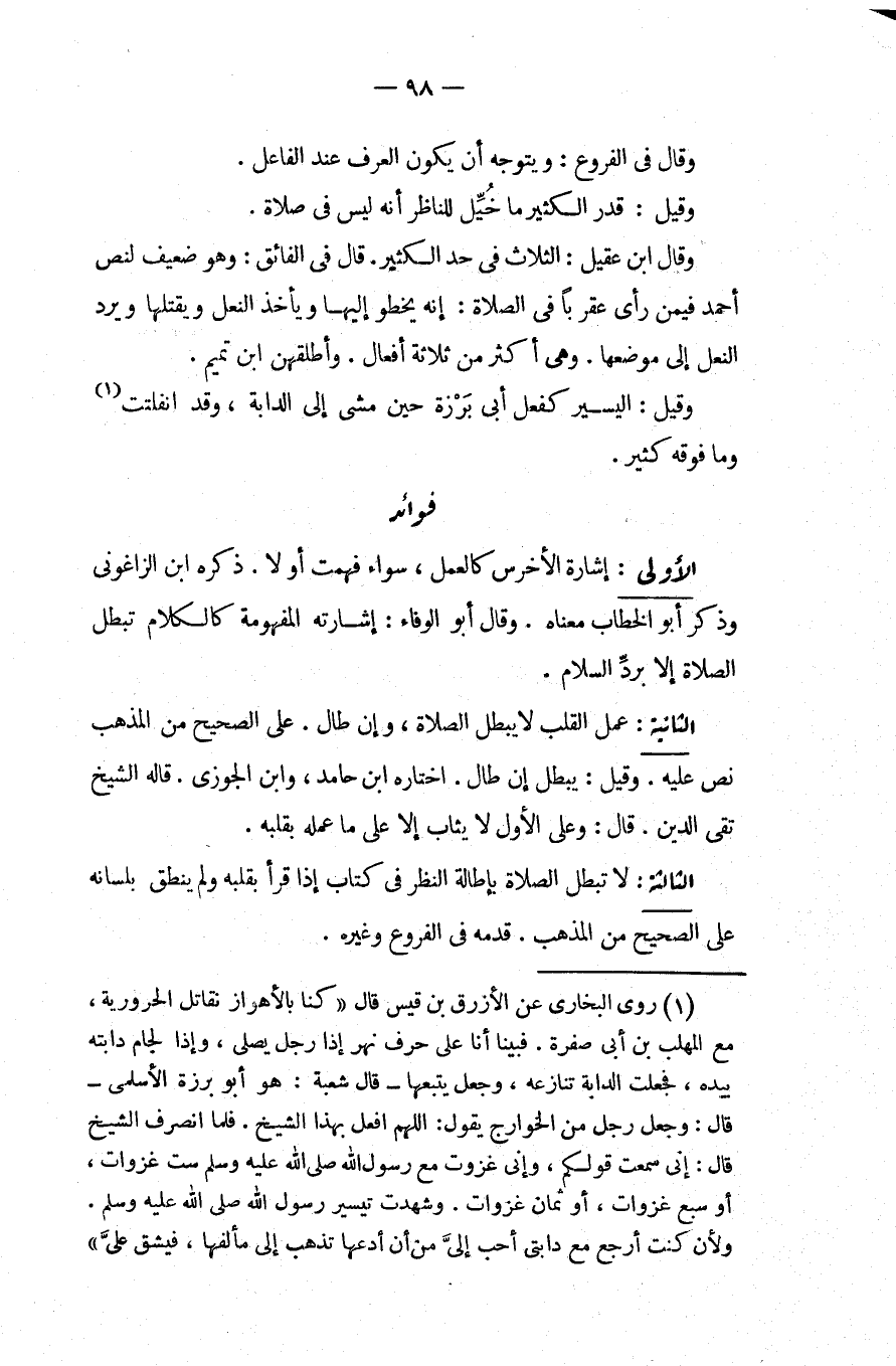فَوَائِدُ. الْأُولَى: إشَارَةُ الْأَخْرَسِ كَالْعَمَلِ، سَوَاءٌ فُهِمَتْ أَوْ لَا، ذَكَرَهُ ابْنُ الزَّاغُونِيِّ وَذَكَرَ أَبُو الْخَطَّابِ مَعْنَاهُ، وَقَالَ أَبُو الْوَفَاءِ: إشَارَتُهُ الْمَفْهُومَةُ كَالْكَلَامِ تُبْطِلُ الصَّلَاةَ إلَّا بِرَدِّ السَّلَامِ.