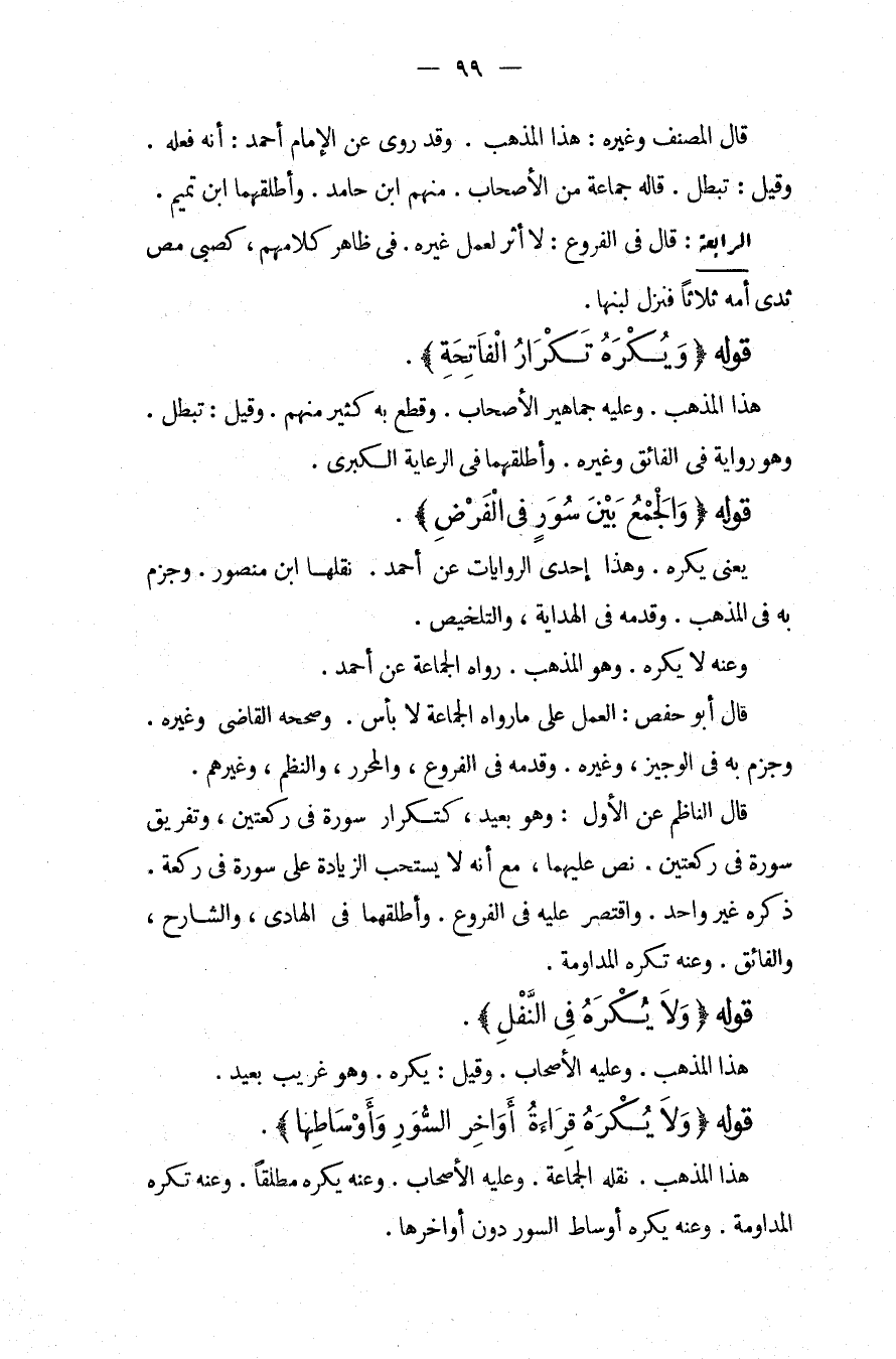 قَوْلُهُ (وَالْجَمْعُ بَيْنَ سُوَرٍ فِي الْفَرْضِ) يَعْنِي يُكْرَهُ، وَهَذَا إحْدَى الرِّوَايَاتِ عَنْ أَحْمَدَ، نَقَلَهَا ابْنُ مَنْصُورٍ وَجَزَمَ بِهِ فِي الْمُذْهَبِ وَقَدَّمَهُ فِي الْهِدَايَةِ، وَالتَّلْخِيصِ، وَعَنْهُ لَا يُكْرَهُ، وَهُوَ الْمَذْهَبُ رَوَاهُ الْجَمَاعَةُ عَنْ أَحْمَدَ قَالَ أَبُو حَفْصٍ: الْعَمَلُ عَلَى مَا رَوَاهُ الْجَمَاعَةُ لَا بَأْسَ وَصَحَّحَهُ الْقَاضِي وَغَيْرُهُ وَجَزَمَ بِهِ فِي الْوَجِيزِ، وَغَيْرِهِ وَقَدَّمَهُ فِي الْفُرُوعِ، وَالْمُحَرَّرِ، وَالنَّظْمِ، وَغَيْرِهِمْ قَالَ النَّاظِمُ عَنْ الْأَوَّلِ: وَهُوَ بَعِيدٌ، كَتَكْرَارِ سُورَةٍ فِي رَكْعَتَيْنِ، وَتَفْرِيقِ سُورَةٍ فِي رَكْعَتَيْنِ نَصَّ عَلَيْهِمَا، مَعَ أَنَّهُ لَا يَسْتَحِبُّ الزِّيَادَةَ عَلَى سُورَةٍ فِي رَكْعَةٍ، ذَكَرَهُ غَيْرُ وَاحِدٍ، وَاقْتَصَرَ عَلَيْهِ فِي الْفُرُوعِ، وَأَطْلَقَهُمَا فِي الْهَادِي، وَالشَّارِحُ، وَالْفَائِقِ، وَعَنْهُ تُكْرَهُ الْمُدَاوَمَةُ. قَوْلُهُ (وَلَا يُكْرَهُ فِي النَّفْلِ) هَذَا الْمَذْهَبُ، وَعَلَيْهِ الْأَصْحَابُ، وَقِيلَ: يُكْرَهُ، وَهُوَ غَرِيبٌ بَعِيدٌ.
