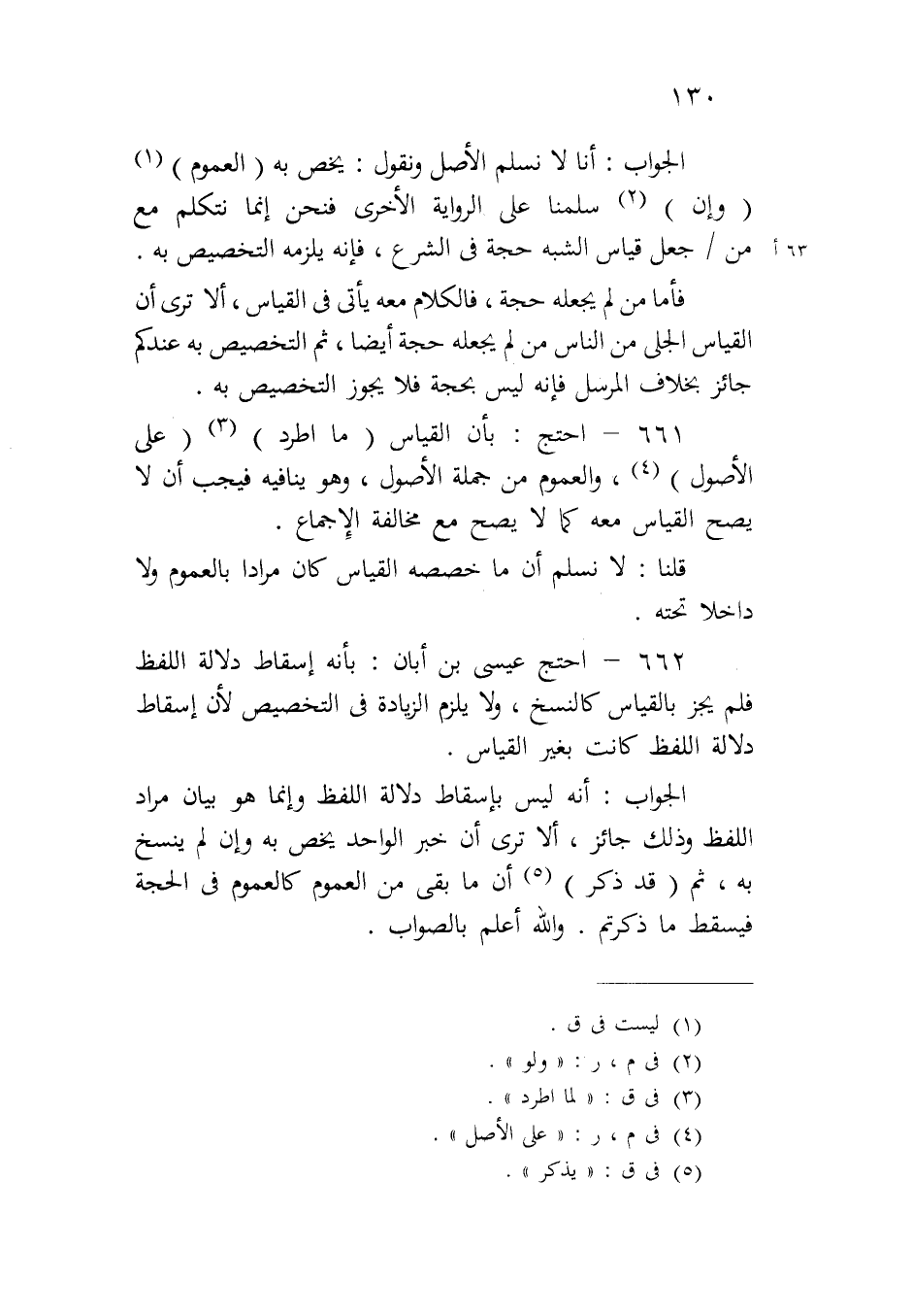الجواب: أنا لا نسلم الأصل ونقول: يخص به (العموم) (وإن) سلمنا على الرواية الأخرى فنحن إنما نتكلم مع من/٦٣ أجعل قياس الشبه حجة في الشرع، فإنه يلزمه التخصيص به.