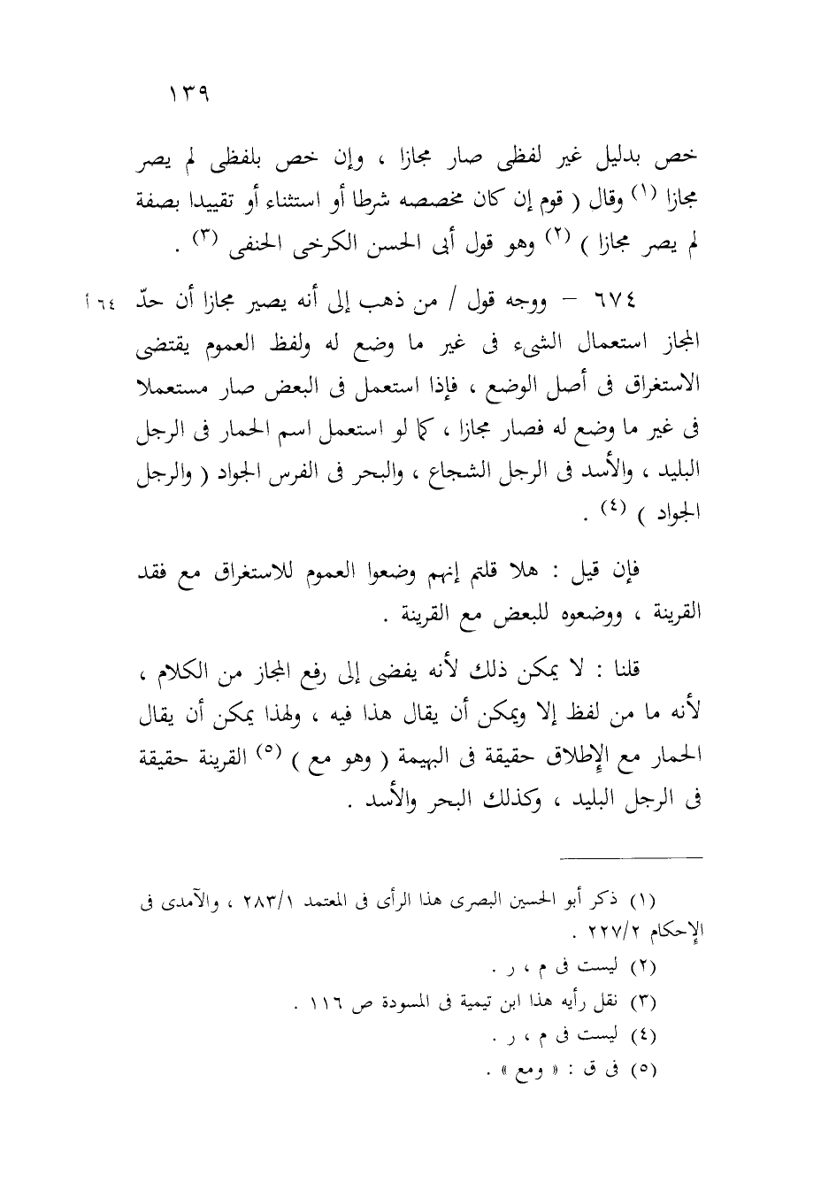 ٦٧٤ - ووجه قول/٦٤ أمن ذهب إلى أنه يصير مجازاً أن حد المجاز استعمال الشيء في غير ما وضع له ولفظ العموم يقتضي الاستغراق في أصل الوضع، فإذا استعمل في البعض صار مستعملاً في غير ما وضع له فصار مجازاً، كما لو استعمل اسم الحمار في الرجل البليد، والأسد في الرجل الشجاع، والبحر في الفرس الجواد (والرجل الجواد).