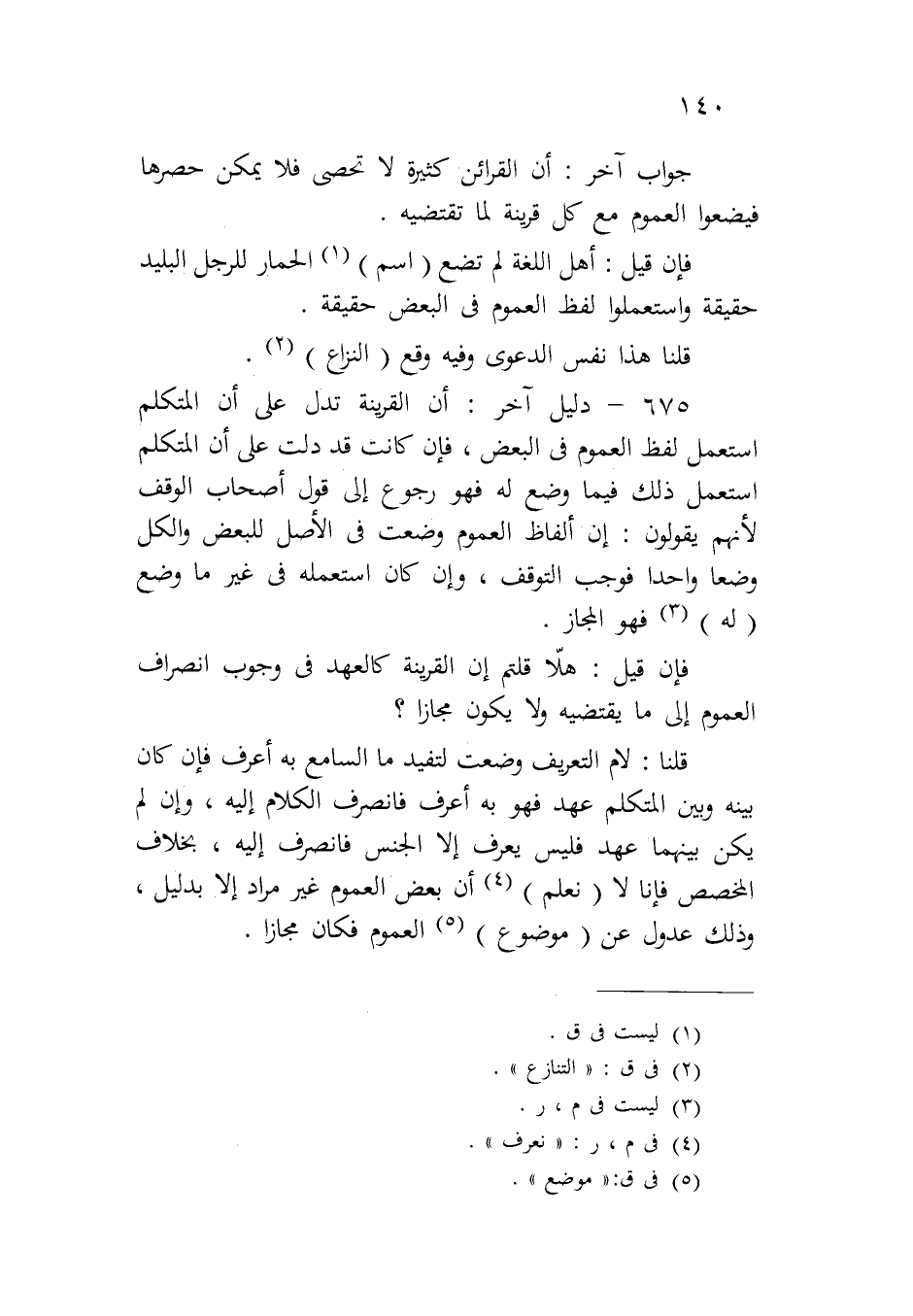 ٦٧٥ - دليل آخر: أن القرينة تدل على أن المتكلم استعمل لفظ العموم في البعض، فإن كانت قد دلت على أن المتكلم استعمل ذلك فيما وضع له فهو رجوع إلى قول أصحاب الوقف لأنهم يقولون: إن ألفاظ العموم وضعت في الأصل للبعض والكل وضعا واحداً فوجب التوقف، وإن كان استعمله في غير ما وضع (له) فهو المجاز.
