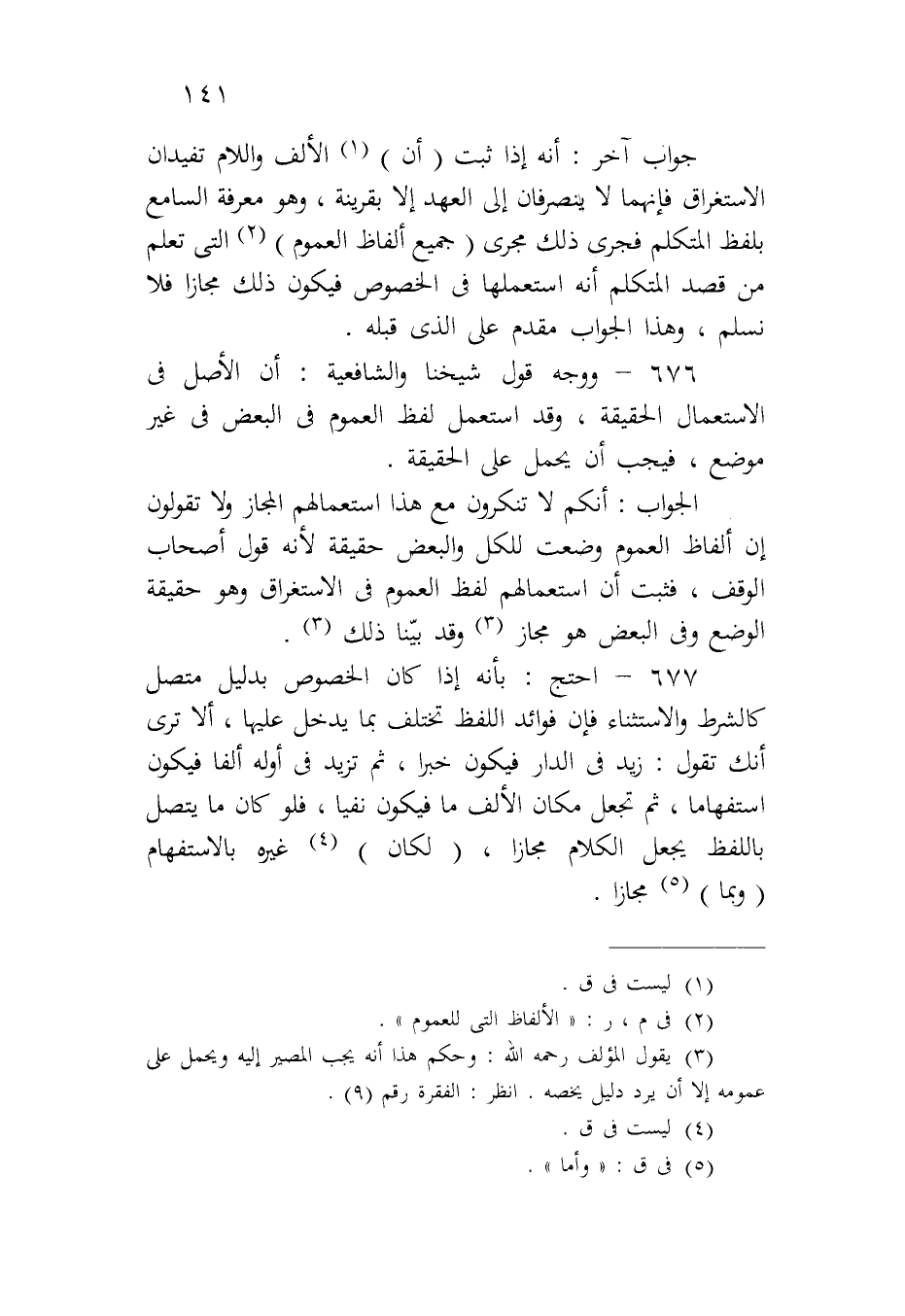 ٦٧٧ - احتج: بأنه إذا كان الخصوص بدليل متصل كالشرط والاستثناء فإن فوائد اللفظ تختلف بما يدخل عليها، ألا ترى أنك تقول: زيد في الدار فيكون خبراً، ثم تزيد في أوله ألفاً فيكون استفهاماً ثم تجعل مكان الألف ما فيكون نفياً، فلو كان ما يتصل باللفظ يجعل الكلام مجازاً، (لكان) غيره بالاستفهام (وبما) مجازا. ً