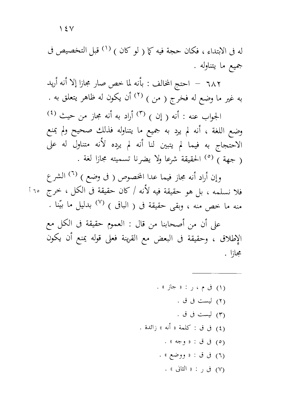 الجواب عنه: أنه (إن) أراد به أنه مجاز من حيث وضع اللغة، أنه لم يرد به جميع ما يتناوله فذلك صحيح ولم يمنع الاحتجاج به فيما لم يتبين لنا أنه لم يرده لأنه متناول له على (جهة) الحقيقة شرعاً ولا يضرنا تسميته مجازاً لغة.