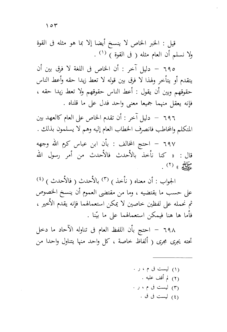 ٦٩٦ - دليل آخر: أن تقدم الخاص على العام كالعهد بين المتكلم والمخاطب فانصرف الخطاب العام إليه وهم لا يسلمون بذلك.