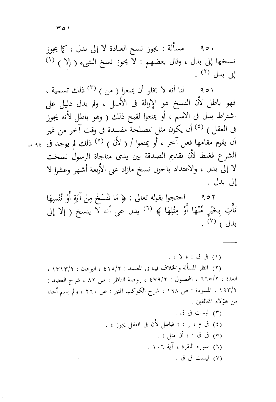 ٩٥١ - لنا أنه لا يخلو أن يمنعوا (من) ذلك تسمية، فهو باطل لأن النسخ هو الإزالة في الأصل، ولم يدل دليل على اشتراط بدل في الاسم، أو يمنعوا لقبح ذلك (وهو باطل لأنه يجوز في العقل) أن يكون مثل المصلحة مفسدة في وقت آخر من غير أن يقوم مقامها فعل آخر، أو يمنعوا/٩٤ ب (لأن) ذلك لم يوجد في الشرع فغلط لأن تقديم الصدقة بين يدي مناجاة الرسول نسخت لا إلى بدل، والاعتداد بالحول نسخ ما زاد على الأربعة أشهر وعشراً لا إلى بدل.