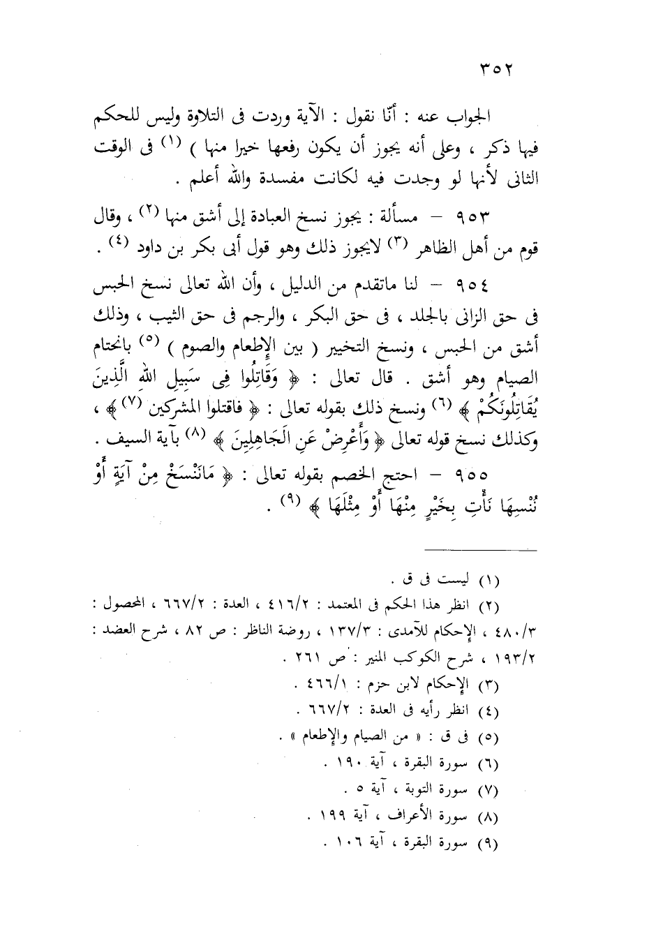 ٩٥٤ - لنا ما تقدم من الدليل، وأن الله تعالى نسخ الحبس في حق الزاني بالجلد، في حق البكر، والرجم في حق الثيب، وذلك أشق من الحبس، ونسخ التخيير (بين الإطعام والصوم) بانحتام الصيام وهو أشق. قال تعالى: {وَقَاتِلُوا فِي سَبِيلِ اللَّهِ الَّذِينَ يُقَاتِلُونَكُمْ} ونسخ ذلك بقوله تعالى: {فَاقْتُلُوا الْمُشْرِكِينَ}، وكذلك نسخ قوله تعالى: {وَأَعْرِضْ عَنْ الْجَاهِلِينَ} بآية السيف.