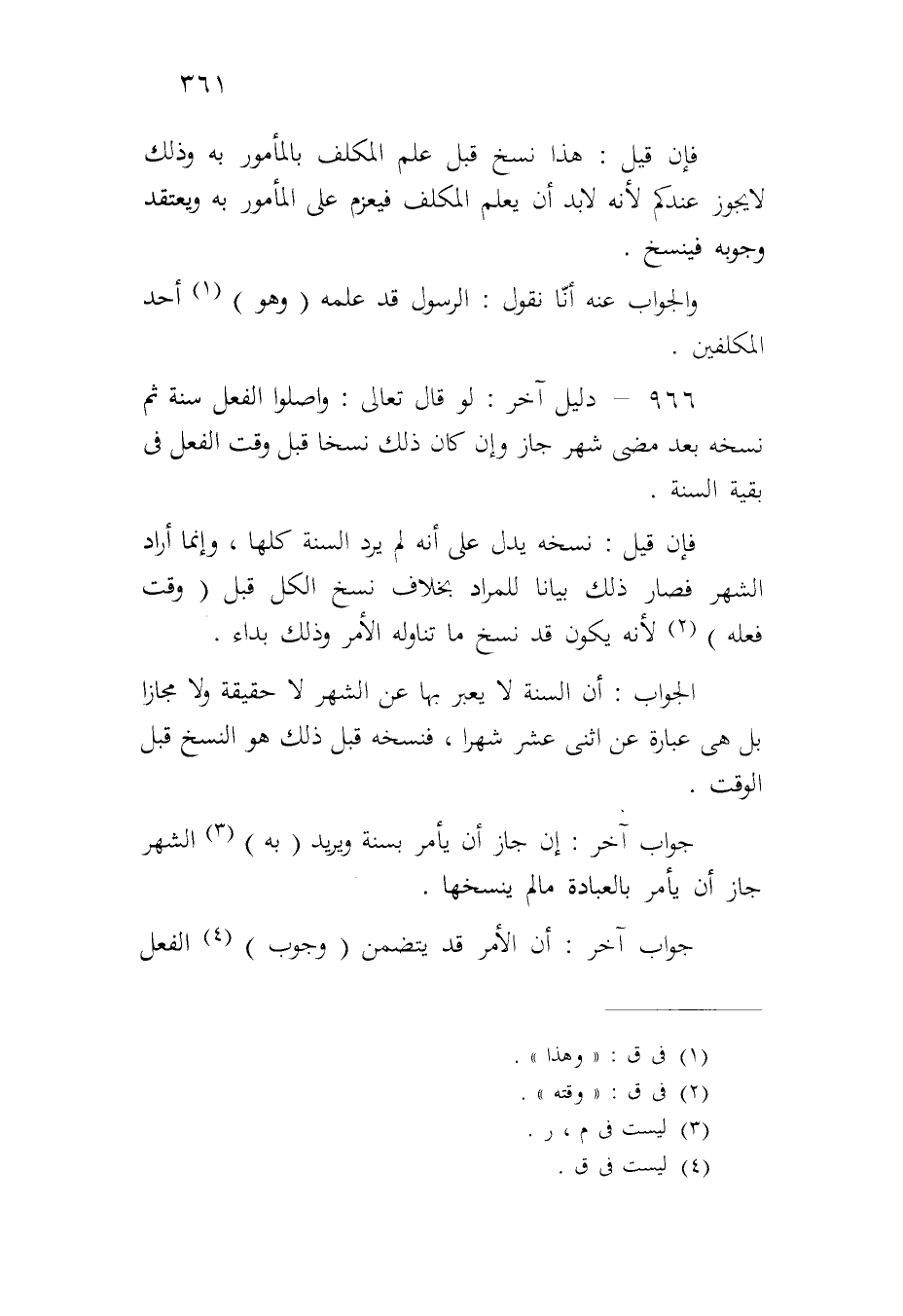 ٩٦٦ - دليل آخر: لو قال تعالى: واصلوا الفعل سنة ثم نسخه بعد مضي شهر جاز وإن كان ذلك نسخاً قبل وقت الفعل في بقية السنة.