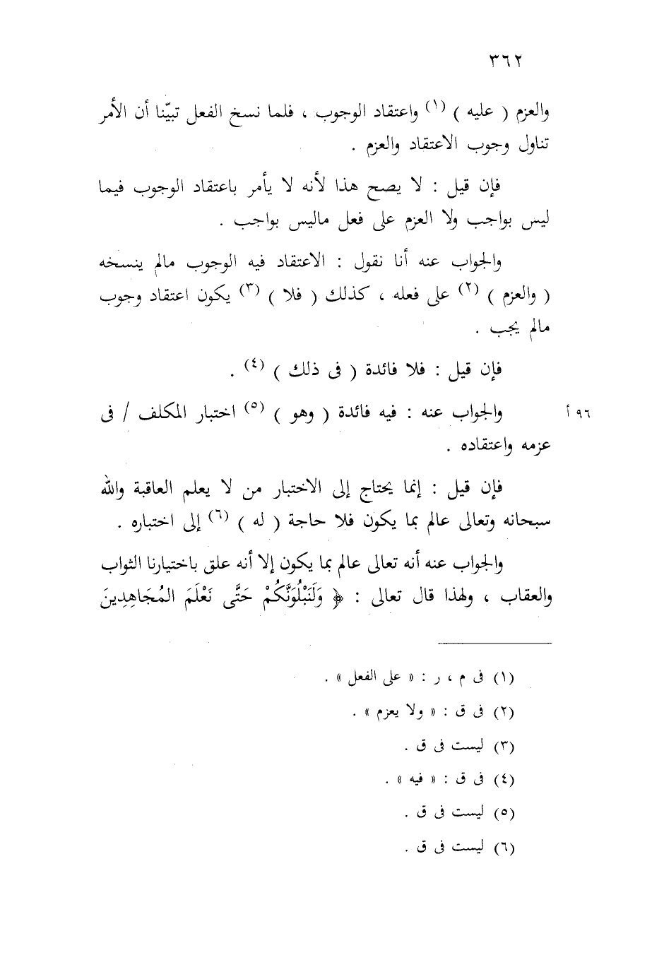 والجواب عنه: فيه فائدة (وهو) اختبار المكلف/٩٦ أفي عزمه واعتقاده.