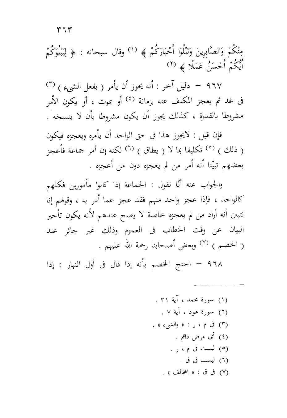 ٩٦٧ - دليل آخر: أنه يجوز أن يأمر (بفعل الشيء) في غد ثم يعجز المكلف عنه بزمانة أو بموت، أو يكون الأمر مشروطاً بالقدرة، كذلك يجوز أن يكون مشروطاً بأن لا ينسخه.