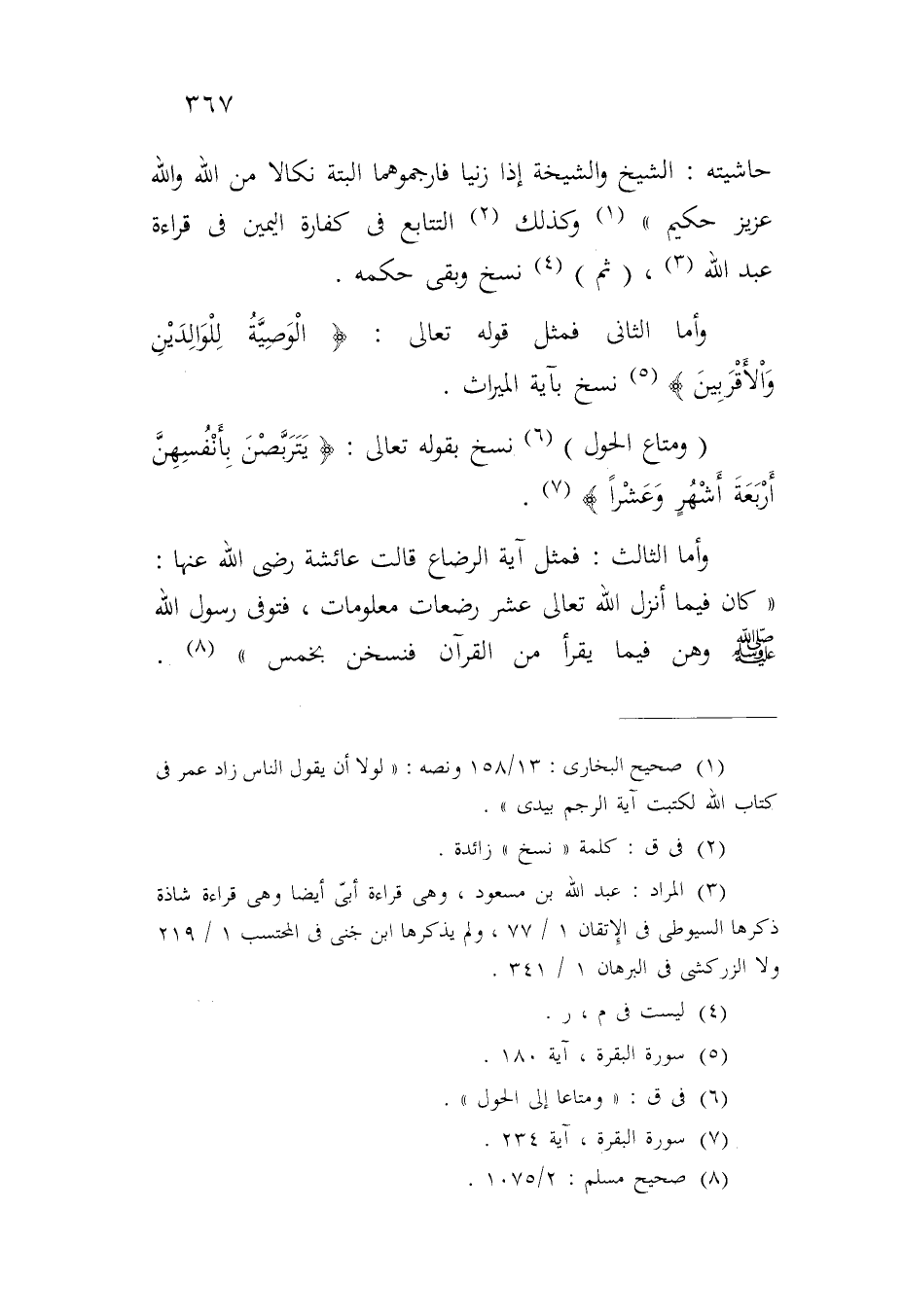 حاشيته: الشيخ والشيخة إذا زنيا فارجموهما البتة نكالا من الله والله عزيز حكيم" وكذلك التتابع في كفارة اليمين في قراءة عبد الله، (ثم) نسخ وبقى حكمه.