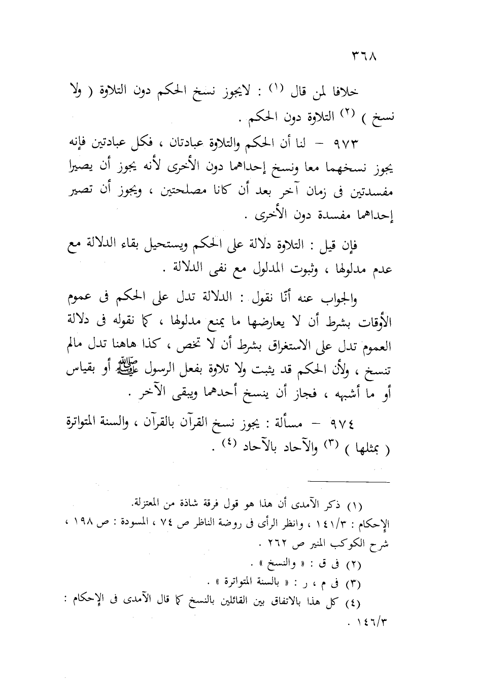 ٩٧٣ - لنا أن الحكم والتلاوة عبادتان، فكل عبادتين فإنه يجوز نسخهما معاً ونسخ إحداهما دون الأخرى لأنه يجوز أن يصيرا مفسدتين في زمان آخر بعد أن كانا مصلحتين، ويجوز أن تصير إحداهما مفسدة دون الأخرى.