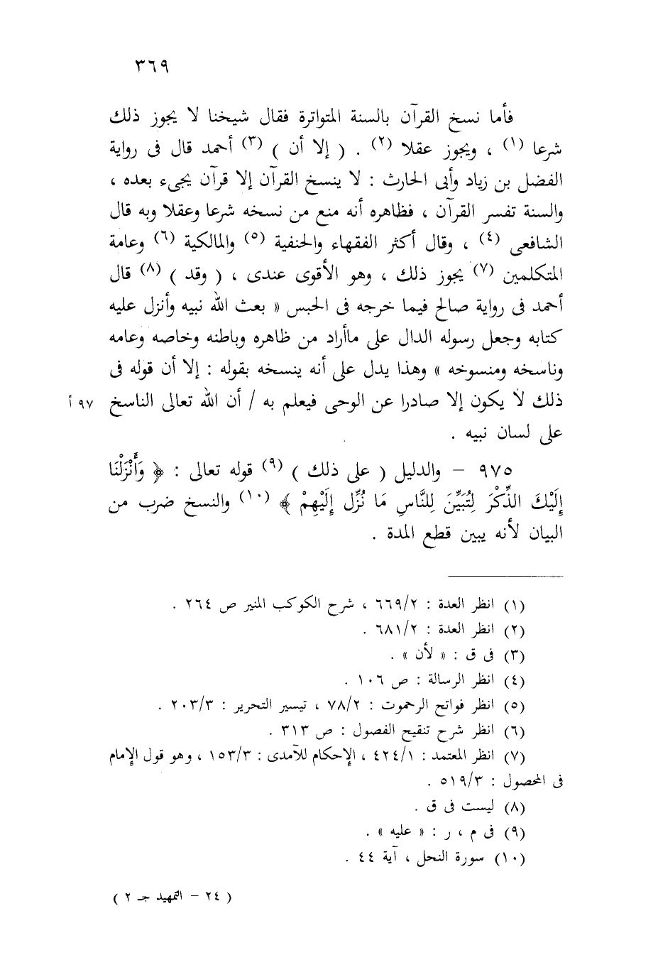 ٩٧٥ - والدليل (على ذلك) قوله تعالى: {وَأَنزَلْنَا إِلَيْكَ الذِّكْرَ لِتُبَيِّنَ لِلنَّاسِ مَا نُزِّلَ إِلَيْهِمْ} والنسخ ضرب من البيان لأنه يبين قطع المدة.